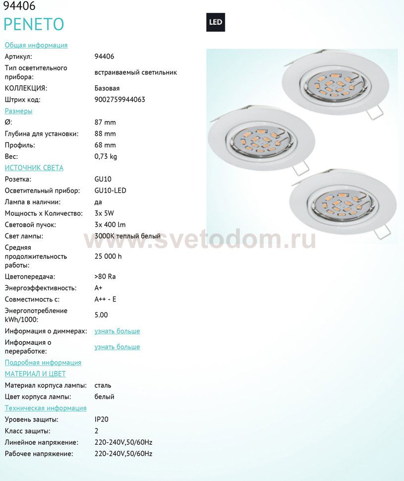 Встраиваемые светильники – популярное осветительное оборудование, которое можно использовать в качестве основного источника или в дополнение к люстре. Они позволяют создать нужную атмосферу атмосферу и привнести в интерьер уют и комфорт. Интернет-магазин «Светодом» предлагает стильный встраиваемый светильник Eglo 94406. Данная модель достаточно универсальна, поэтому подойдет практически под любой интерьер. Перед покупкой не забудьте ознакомиться с техническими параметрами, чтобы узнать тип цоколя, площадь освещения и другие важные характеристики. Приобрести встраиваемый светильник Eglo 94406 в нашем онлайн-магазине Вы можете либо с помощью «Корзины», либо по контактным номерам. Мы развозим заказы по Москве, Екатеринбургу и остальным российским городам.