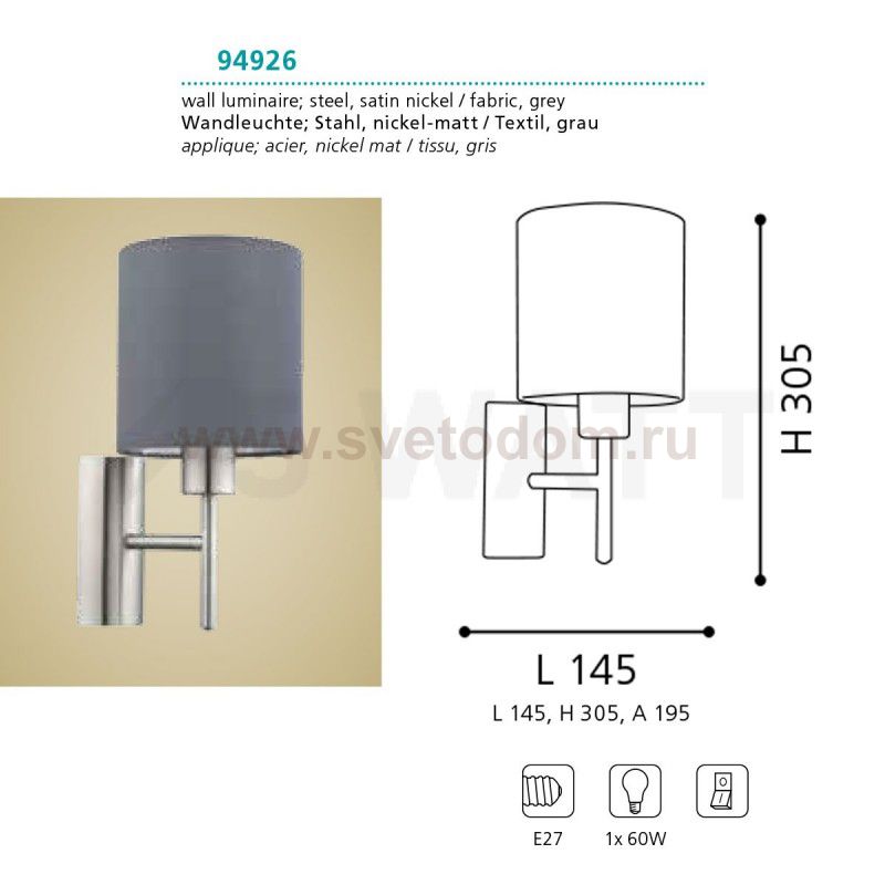 Бра PASTERI, 1х60W (E27), L145, H305, A195, никель матовый/текстиль, серый применяется преимущественно в домашнем освещении с использованием стандартных выключателей и переключателей для сетей 220V.