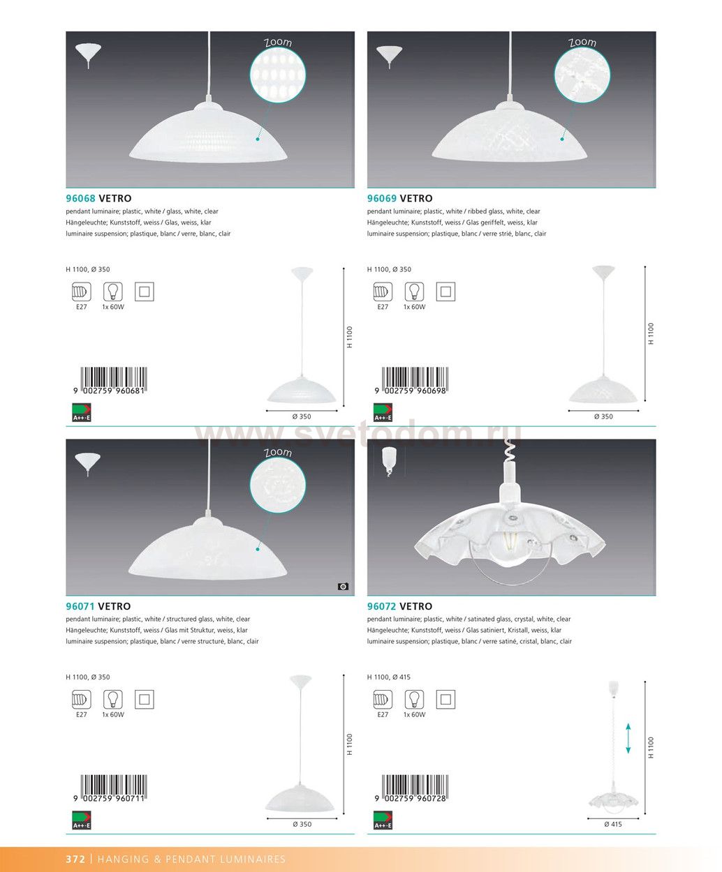 Подвес VETRO, 1х60W(E27), ?350, пластик, белый/структур. стекло, белый, прозрачный применяется преимущественно в домашнем освещении с использованием стандартных выключателей и переключателей для сетей 220V.