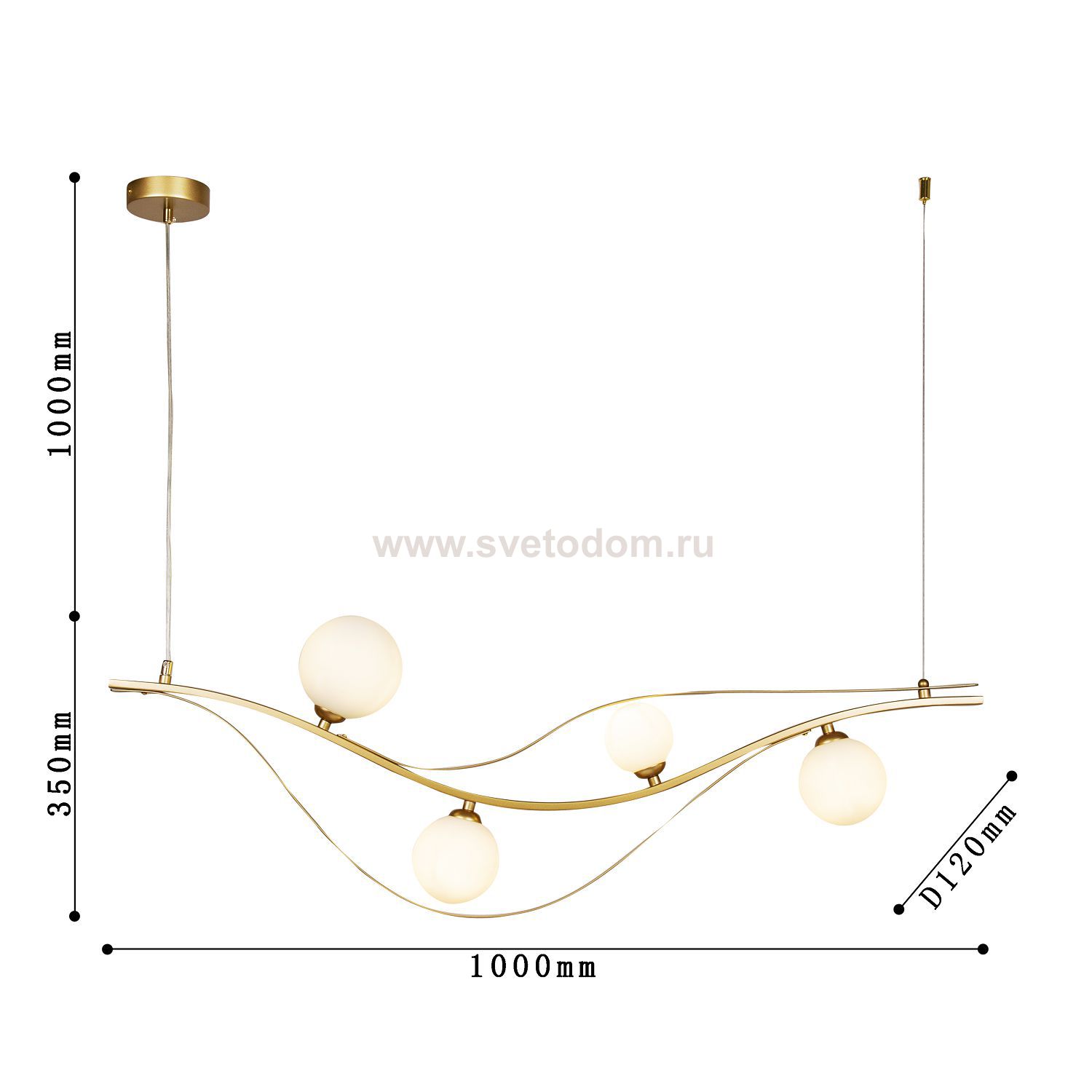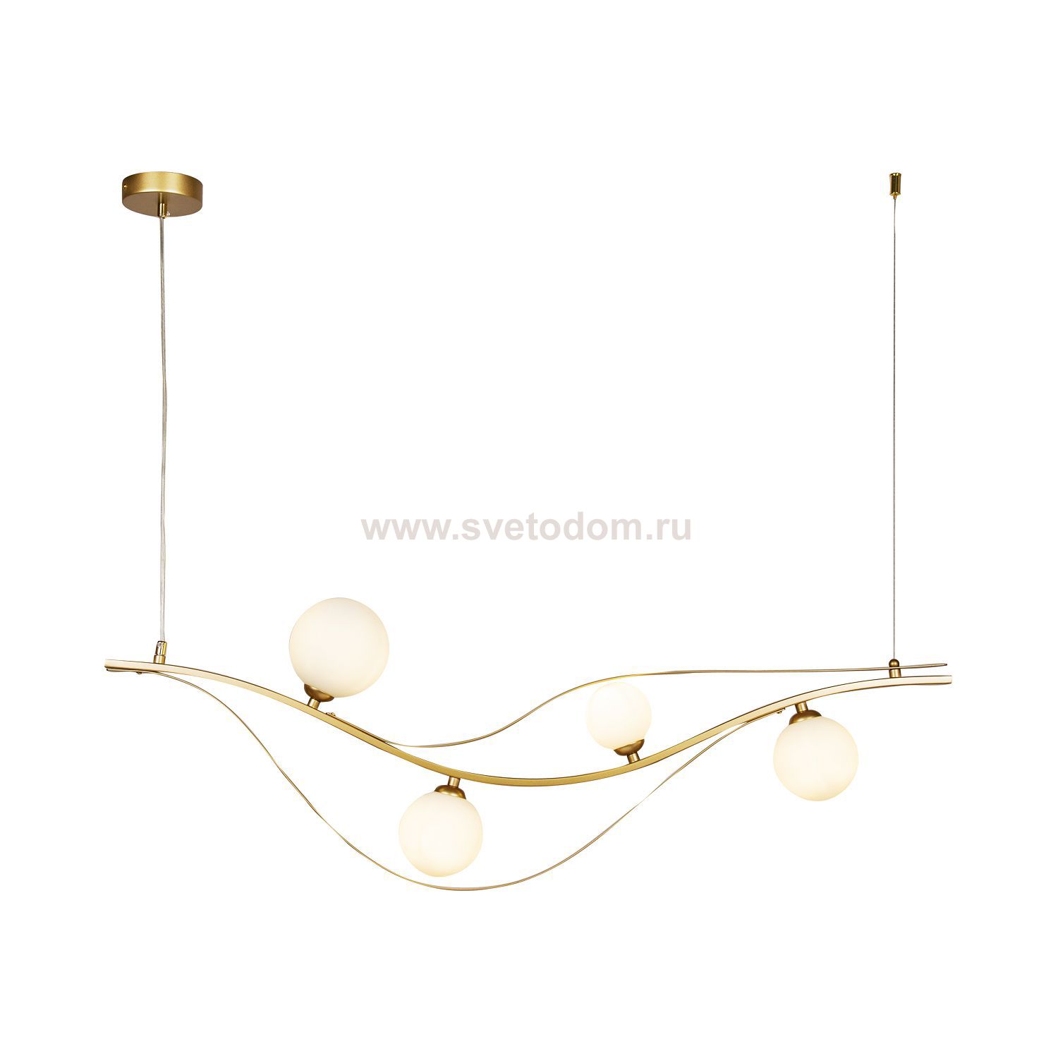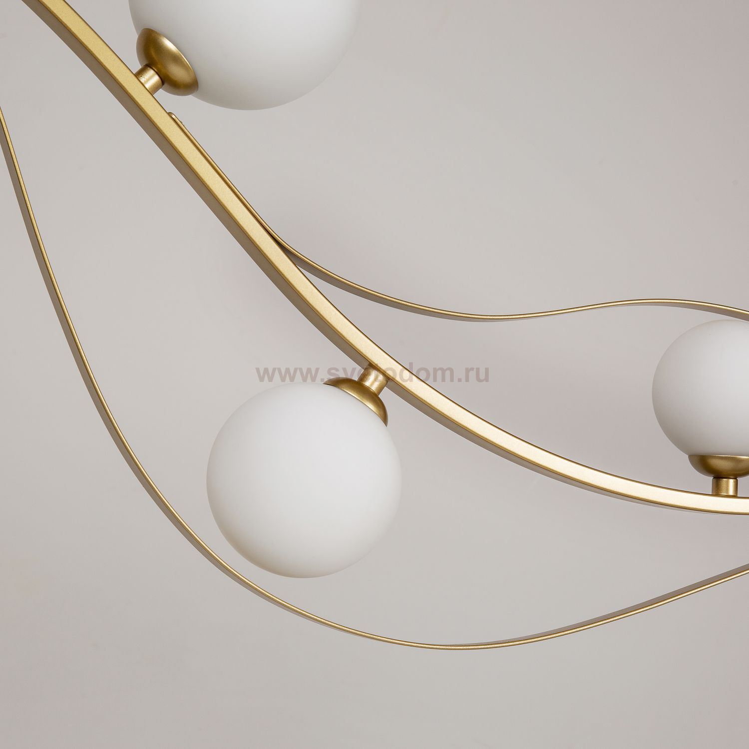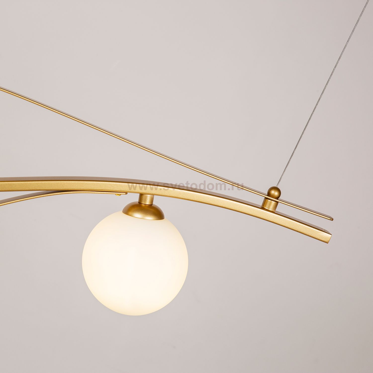 каркас изогнутой формы цвета золота, плафоны из выдувного стекла белого цвета, часть каркаса фиксируется тросиком для баланса Серия