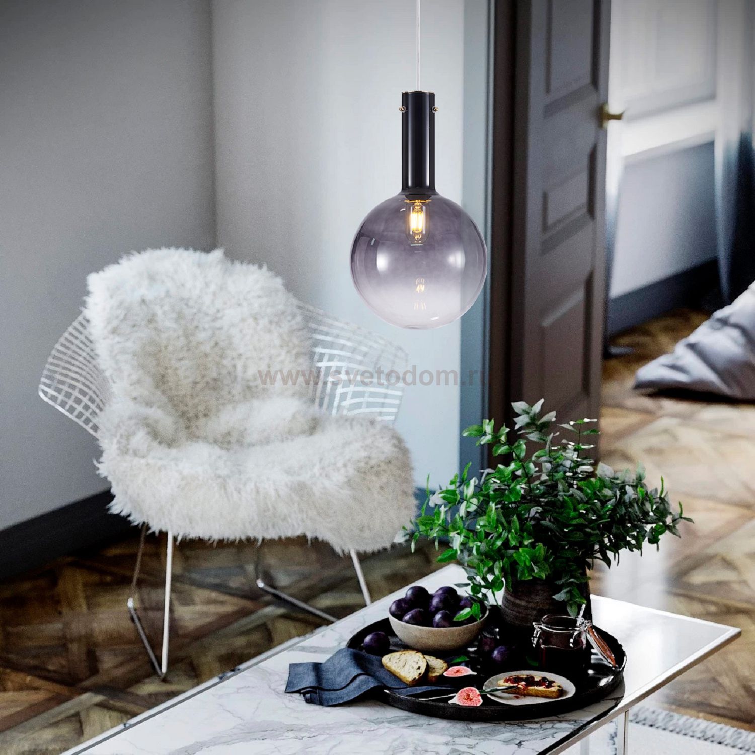 Выдувной плафон из стекла с градиентным нанесением цвета бузины. Арматура белого цвета. Лампы можно менять. Декор