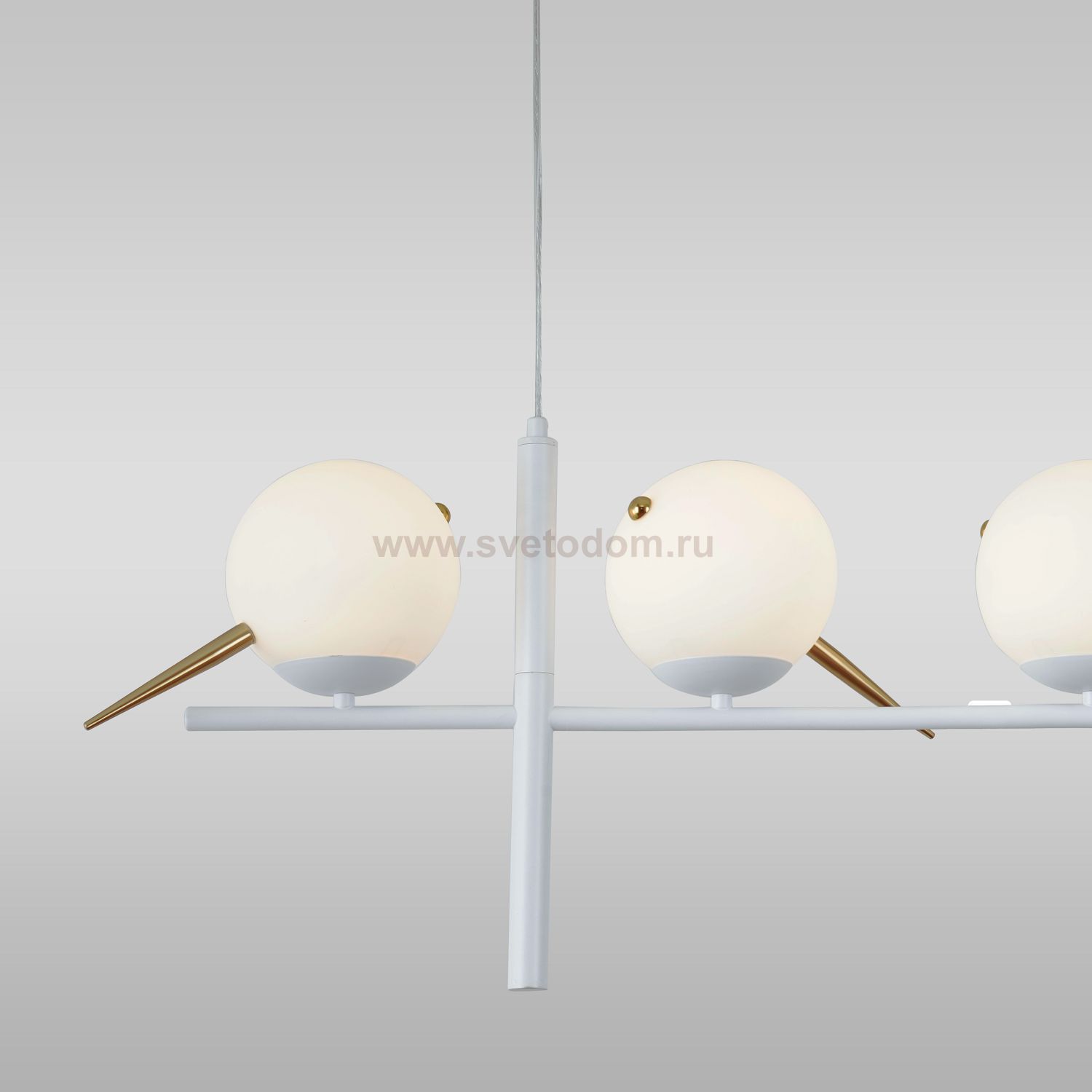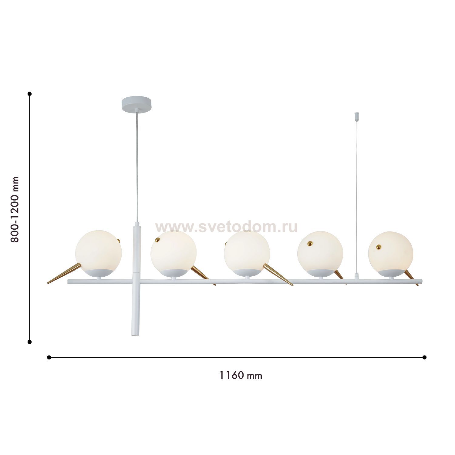 Каркас белого цвета, выдувные плафоны из стекла белого цвета с декоративными элементами из металла золотого цвета. Высота подвесной люстры регулируетс Серия