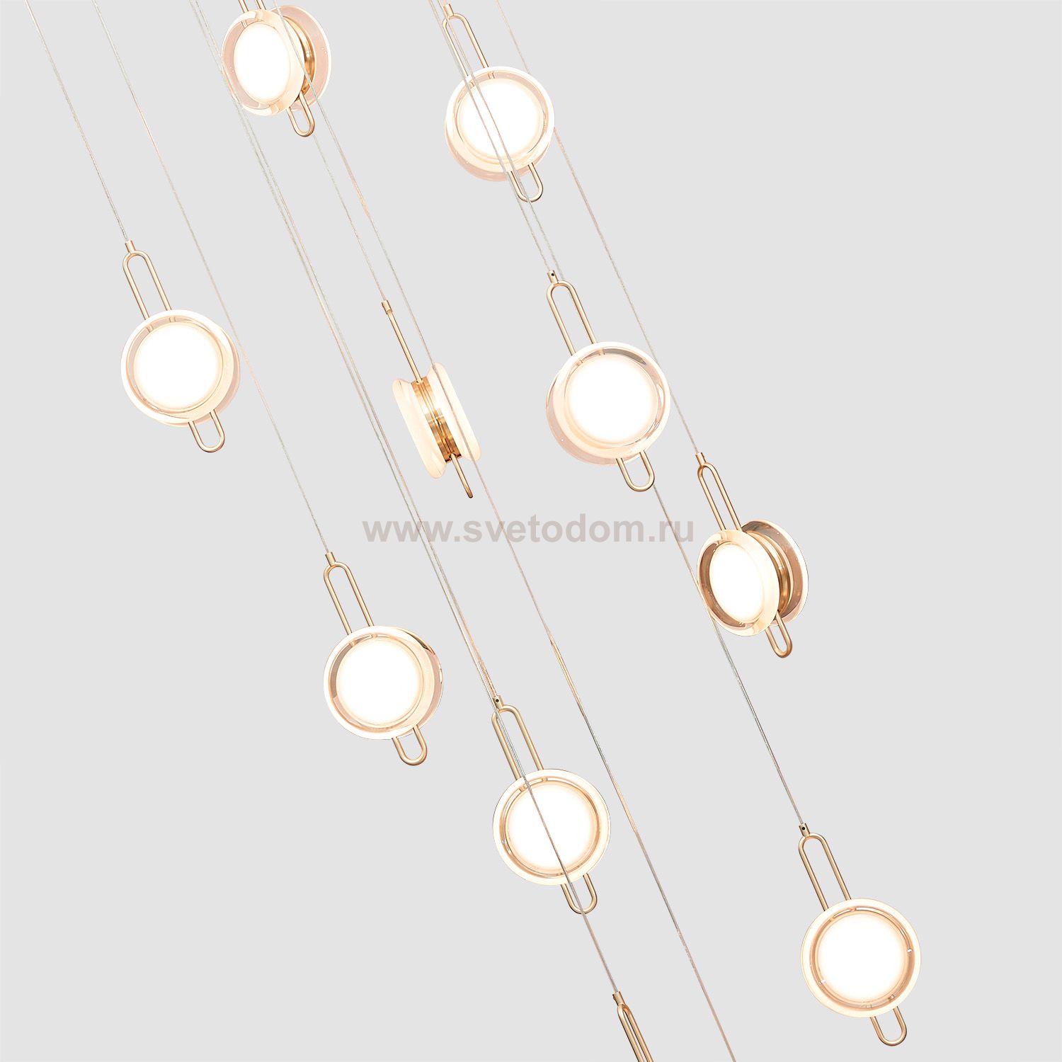 Потолочная люстра с золотым каркасом, диметром 60 см, оригинальная форма акриловых плафонов, диск с прозрачным объемным ободком и плоской матовой внут Серия