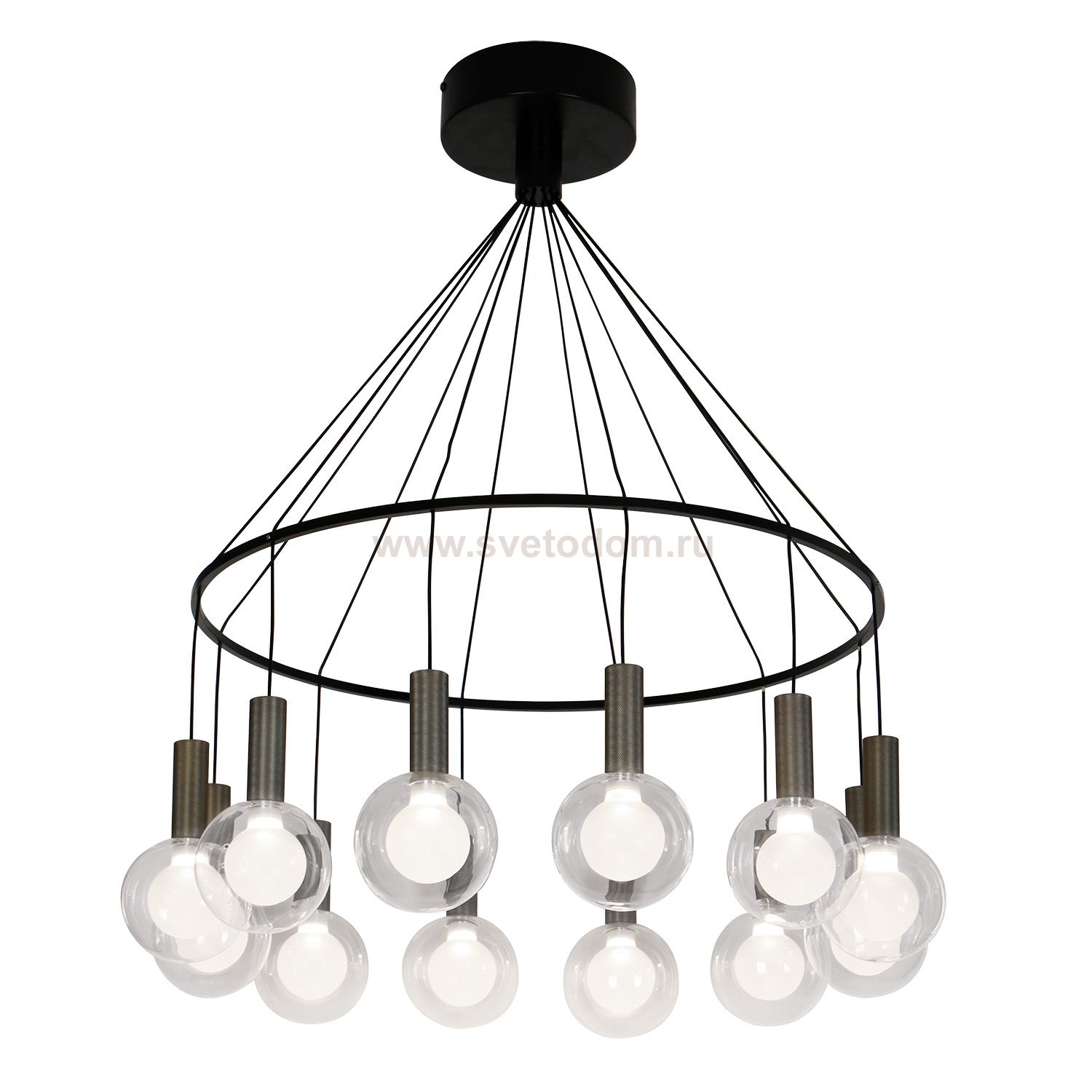 Подвесная люстра в цвете матовый черный с плафонами из двойного стекла — прозрачного снаружи и матового внутри, декоративные цоколи в форме металличес Серия