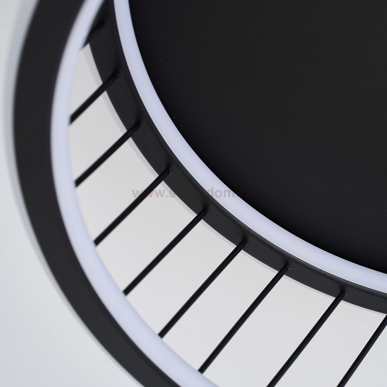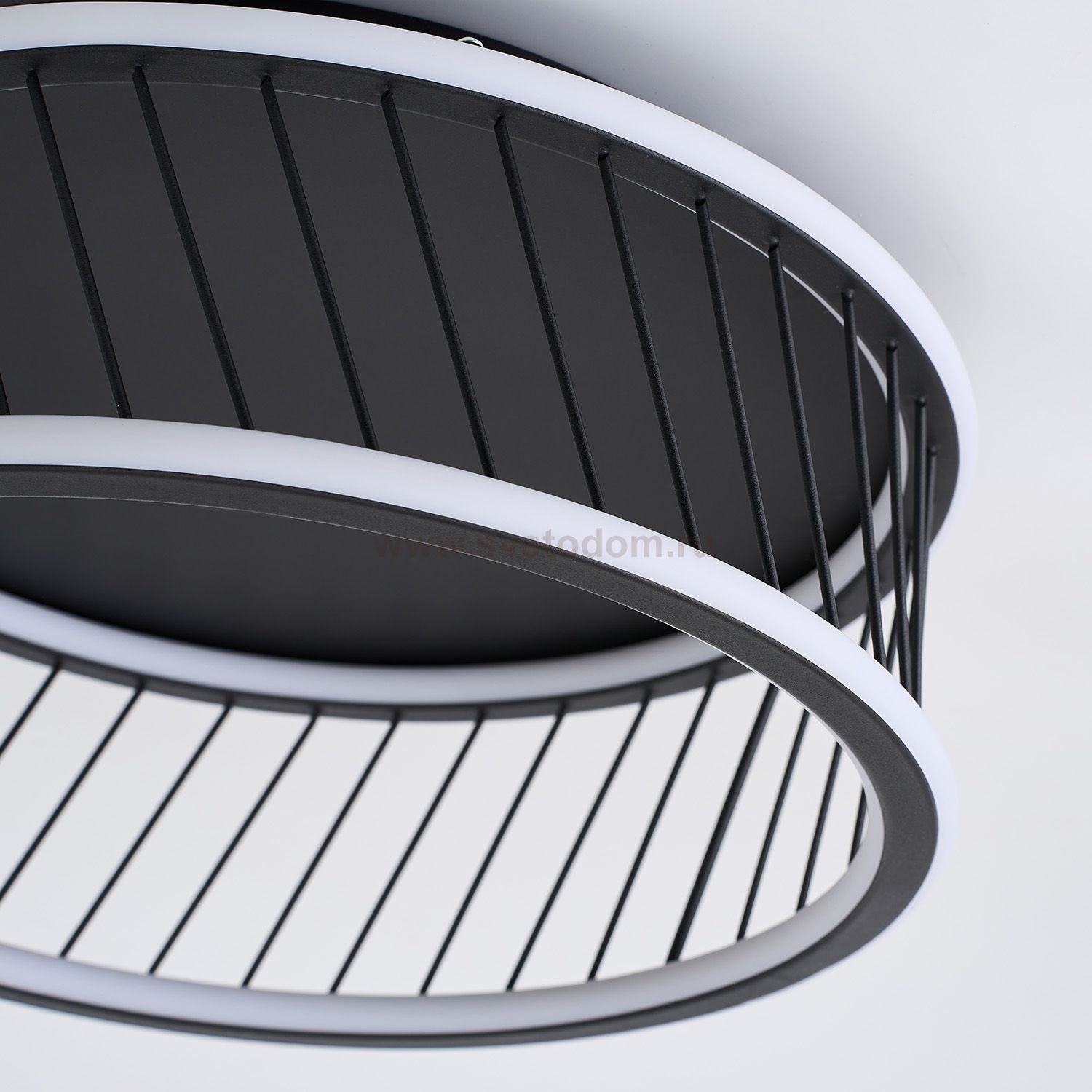 Округлое верхнее и нижнее основание черного цвета, LED-лента, регулируется пультом управления. Плафон - решетка из черных матовых металлических прутик Серия
