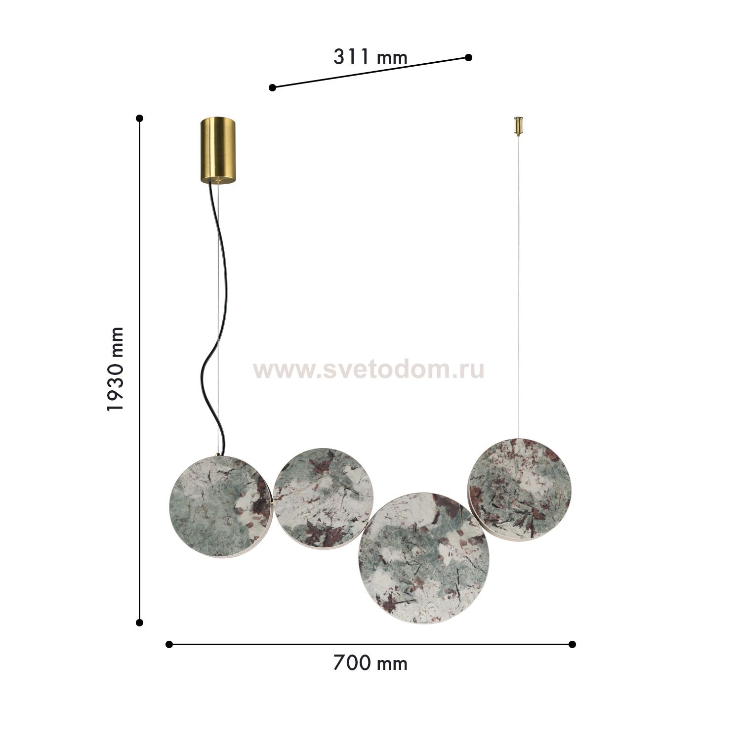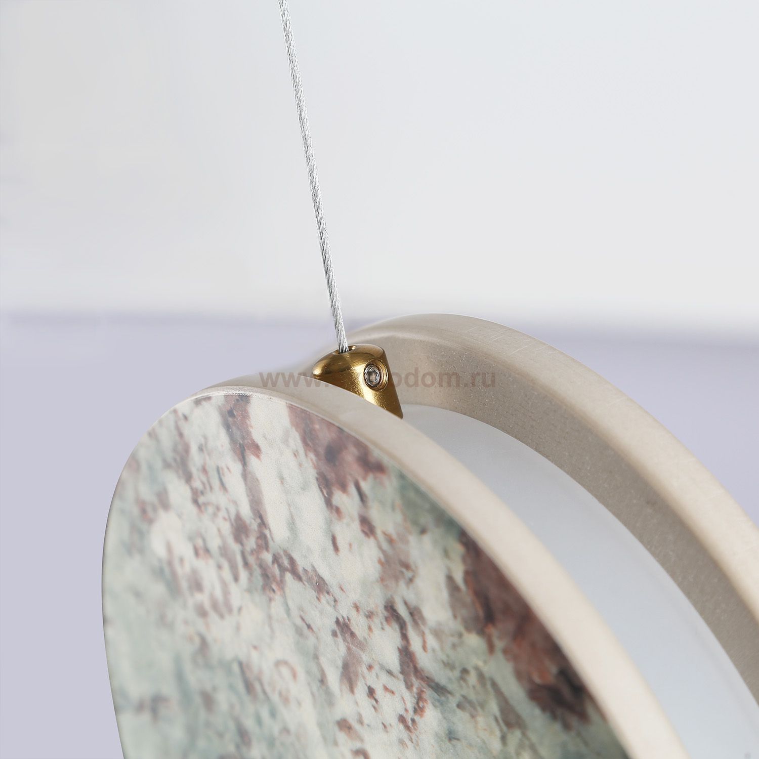 Плафоны из искусственного мрамора серо-зеленого оттенка в форме диска, светящегося по контуру, чаша крепления золотого цвета. Декор