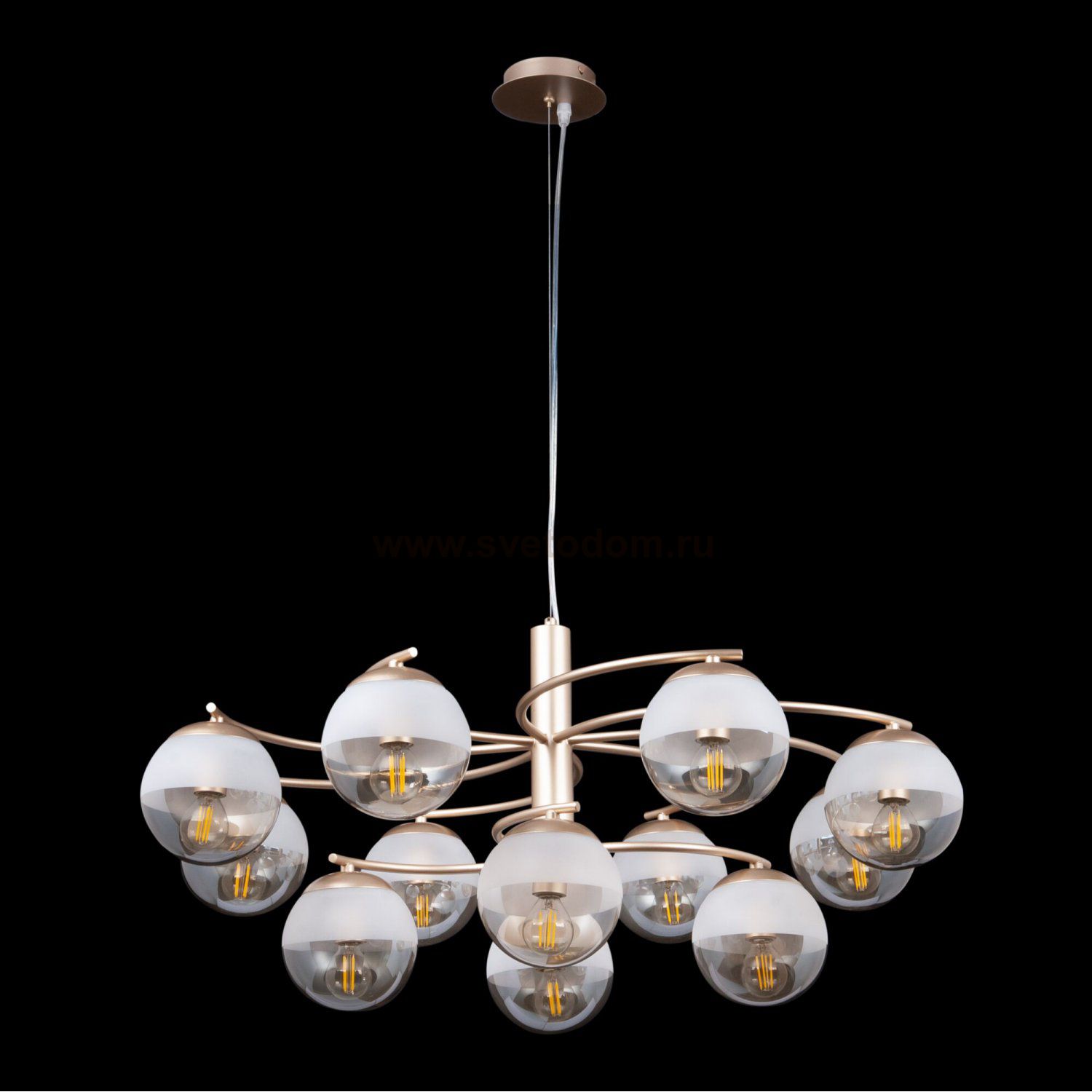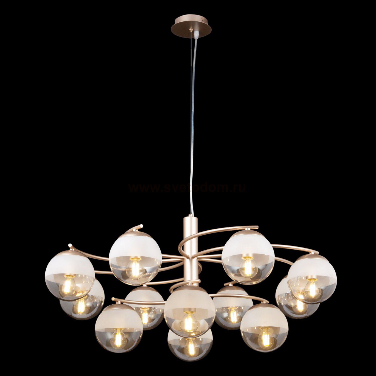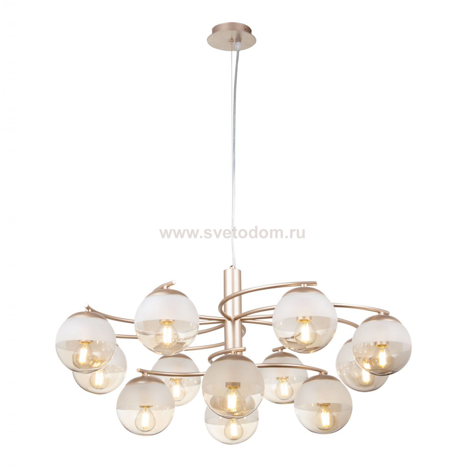 Особенности модели FR5018PL-12G: Необычный дизайн светильников Ostin надолго остается в памяти. Арматура из металла цвета матового золота гармонично сочетается со стеклянными плафонами янтарного цвета. Сверху стекло плафонов матировано, чтобы скрыть патрон, однако, это не мешает прохождению света. Благодаря креплению на трос можно регулировать длину подвесных светильников. Минимальная высота составляет около 40 сантиметров, что позволяет использовать светильники в помещения с невысокими потолками. В серии представлены подвесные светильники на 12 и 9 ламп.