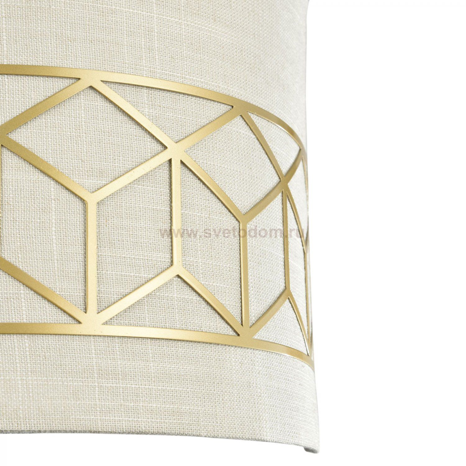 Арматура из металла золотого цвета. Абажур – натуральный лен на ПВХ. Металли ческий орнамент опоясывает абажур. Льняной рассеиватель.