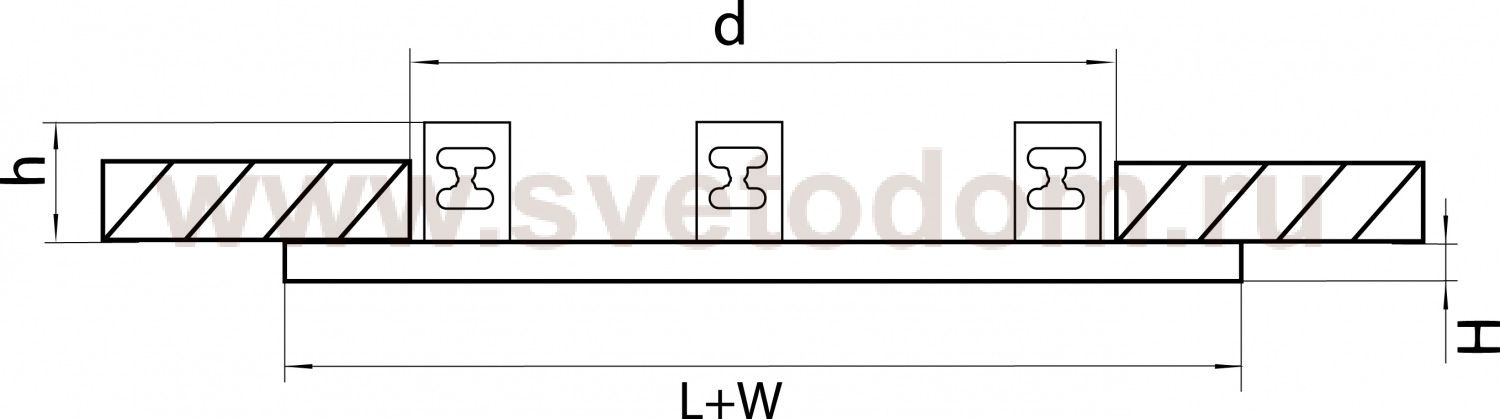 Врезное отверстие: h35 d90; Внешние габариты: H2 L340 W140; Материал - основание/плафон: металл; Цвет-основание/плафон: белый; Лампа: МR16 max 50 Вт;