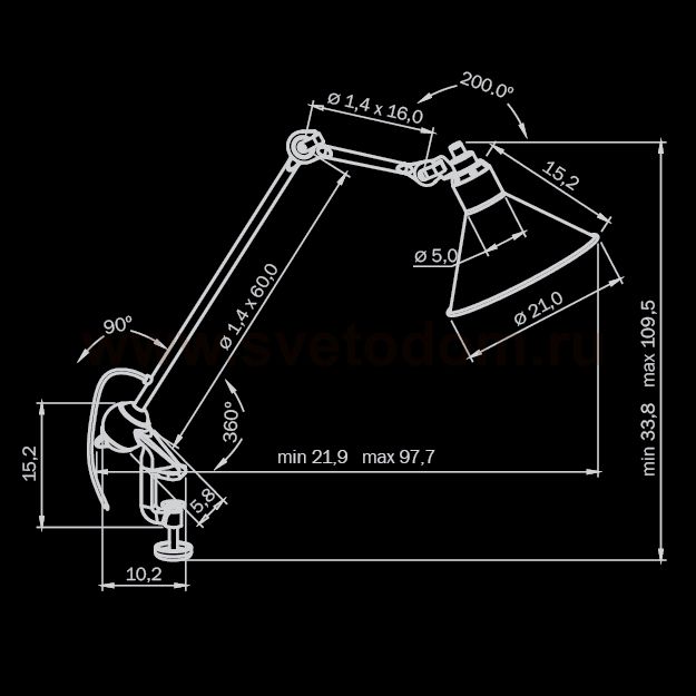 Высота min-max (см): 33,8-109,5; Ширина (см): 21; Глубина (см): 21,9-97,7; Вес (кг): 2; Кол-во ламп: 1хE14; Мощность max (W): 40; Цвет основания/цвет стекла или абажура: Black; Штрих-код