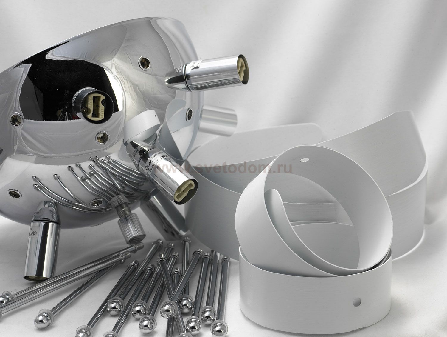 Потолочная дизайнерская люстра белого цвета. Собирается на полусферическом каркасе даже без знаний в области электрики. Лампы располагаются на полусферическом основании и излучаемый ими свет рассеивается белыми лепестками.