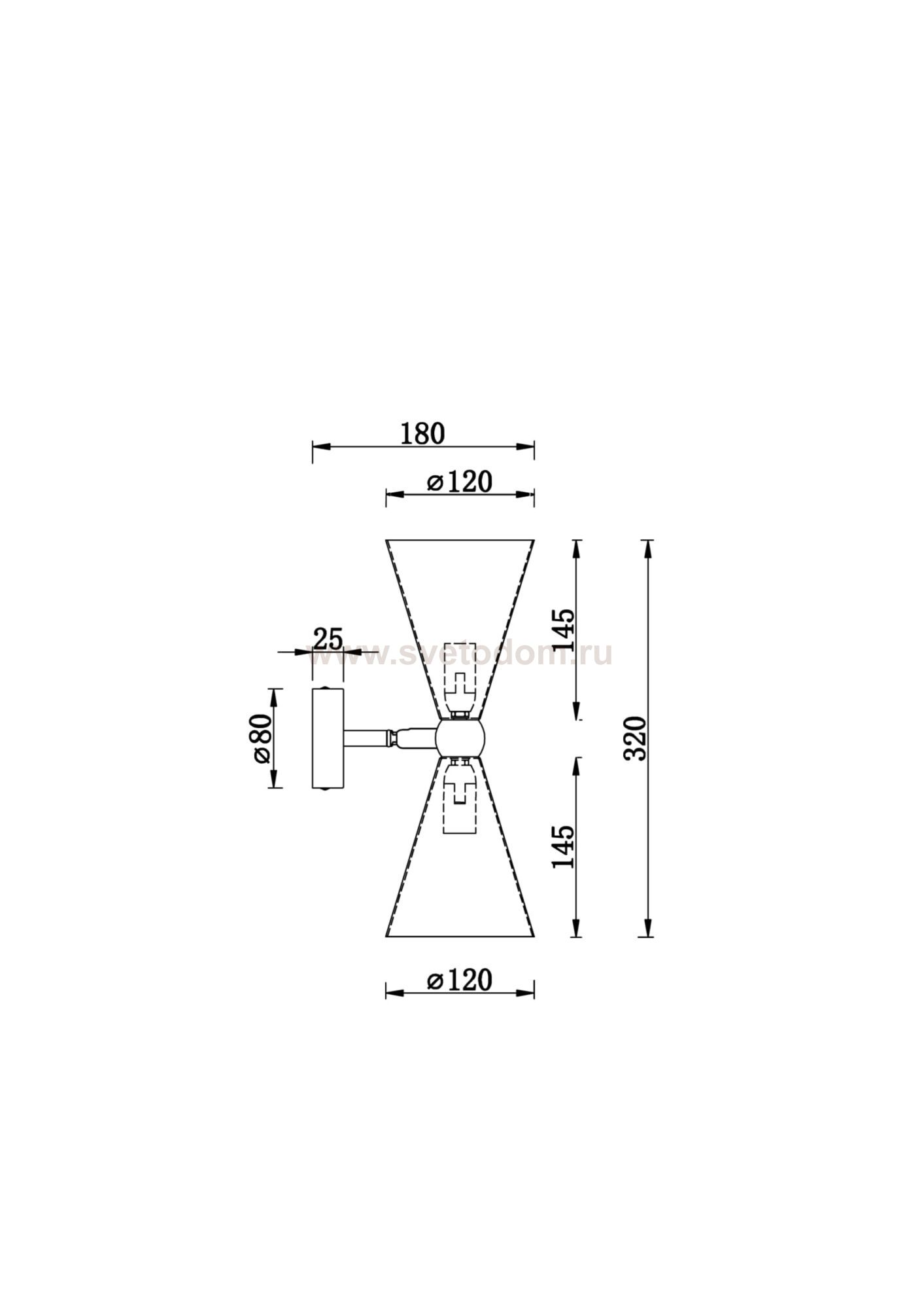 Материал арматуры - металл, оттенок – золото. Металлические плафоны изнутри окрашены в золотой цвет, снаружи в двух вариантах: черный и белый. Поворотный механизм, рожки вращаются. Источник света - лампа с цоколем Е14.