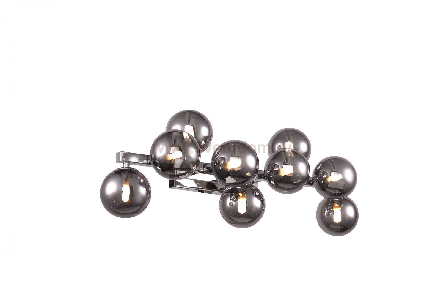 Металлическая арматура в четырех цветах: матовый черный, хром, золото, латунь. Плафоны — выдувное стекло. Цвета — дымчатый, янтарный, коньячный. Дизайн с имитацией молекулярной структуры. Высота подвесных светильников регулируется тросом. Лампа с цоколем G9.
