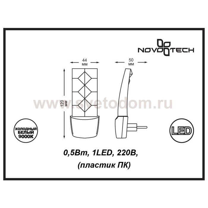 Светильник-ночник (в розетку) светодиодный с датчиком света модели Novotech 357331 из серии NIGHT LIGHT отличается следующим качеством: Корпус светильника сделан из пластика ПК. Преимуществами данного материала являются: 1. Химическая инертность – материал устойчив к воздействию кислот и щелочей, продуктов нефтепереработки; 2. Устойчивость к воздействию влаги; 3. Ударопрочность; 4. Долговечность; 5. Ровная поверхность Датчик света (датчик освещённости) – свет включается при наступлении темноты и недостаточном освещении.