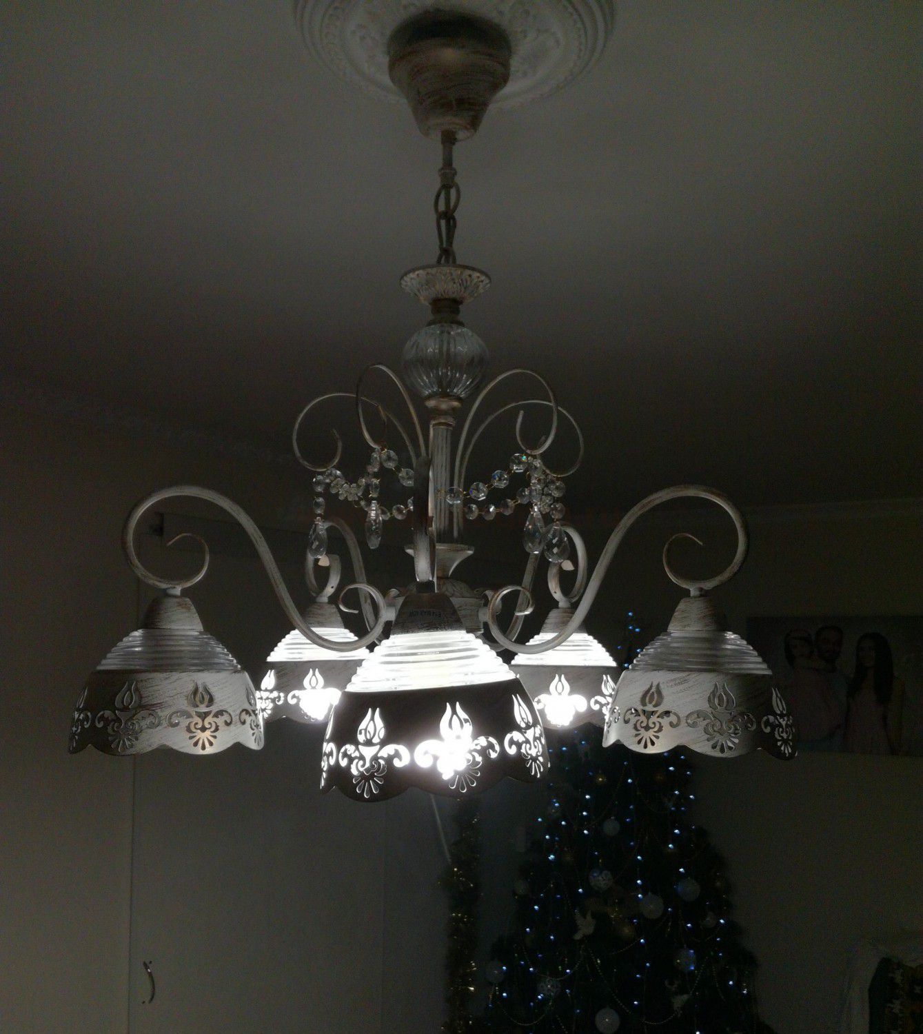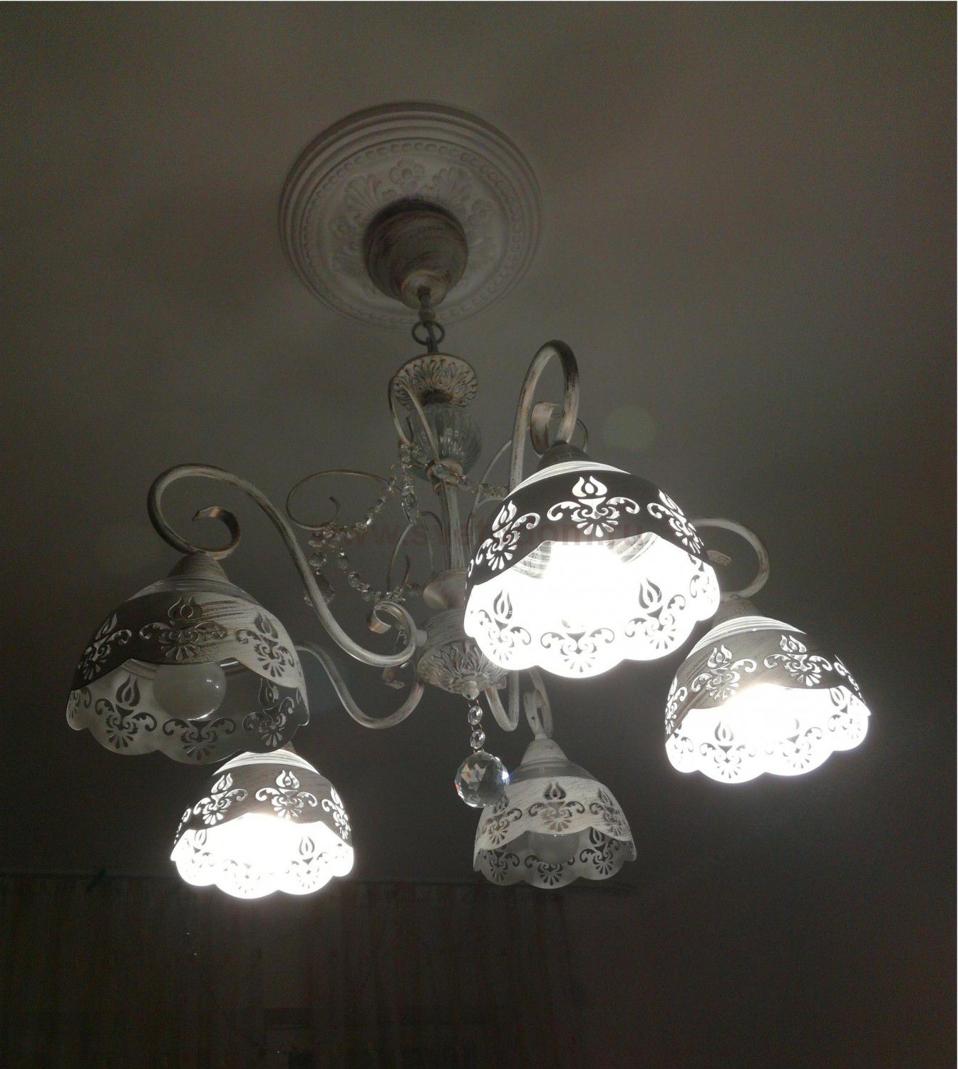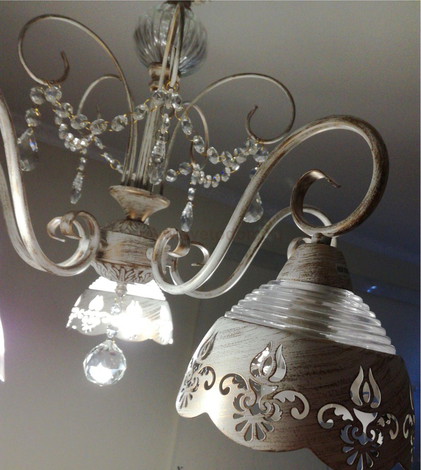 Арматура, декор: ажурный металлический декор, подвески из хрусталя; плафон: тисненое стекло, металл с ажурным рисунком Материал плафона