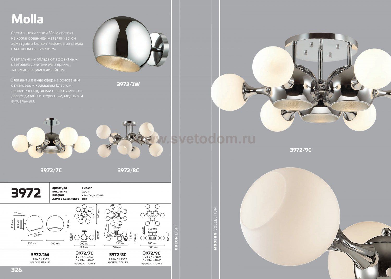 Люстра 3972 / 7C линии Molla состоит из хромированной металлической арматуры и белых плафонов из стекла с матовым напылением. Люстра обладает эффектным цветовым сочетанием и ярким, запоминающимся дизайном. Элементы в виде сфер на основании с глянцевым хромовым блеском дополнены круглыми плафонами, что делает светильник интересным, модным и актуальным. Цоколь E27. Мощность 1*60W. Цоколь E14. Мощность 6*40W. Нет ламп в комплекте.