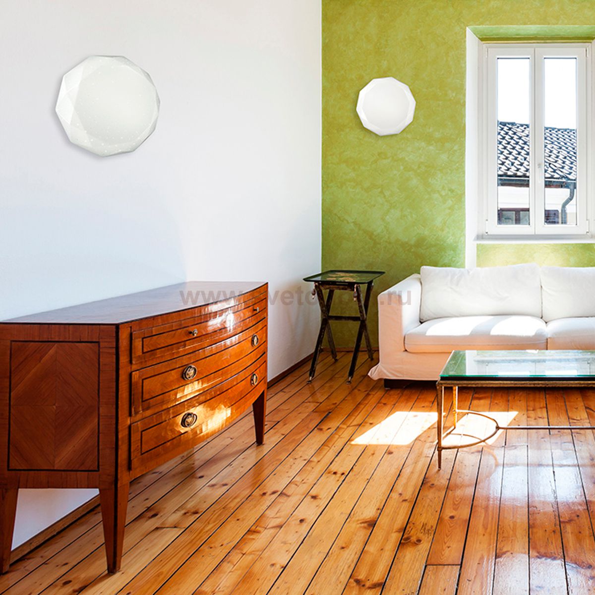 Светильник 2012/EL линии TORA состоит из металлического основания (базы) и пластикового рассеивателя. Материал рассеивателя - высококачественный акрил белого цвета с глянцевой поверхностью, обеспечивающий светильнику равномерное рассеивание и хорошее светопропускание. Форма плафона: круглая, декорирована рельефным орнаментом по краям и рисунком в виде прозрачных точек, которые придают включенному светильнику красивый эффект "звездного мерцания" и переливания. Степень защиты IP43 позволяет использовать светильник в определенных зонах влажных помещений. В комплект входит заменяемый LED модуль с линзами, мощностью 72Вт, которая соответствует лампе накаливания 520Вт. А также пульт ДУ, с помощью которого осуществляется плавное изменение цветовой температуры 3000-6000К, изменение яркости, переход в режим переключения теплого/белого/холодного/ночного света. Светильник имеет функцию "память".