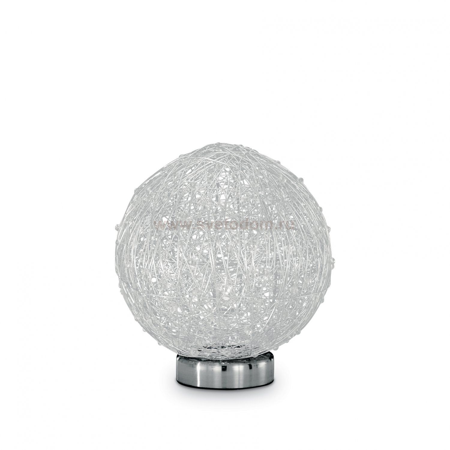 Настольная лампа от известной итальянской фабрики Ideal lux из каталога Moderno в современном стиле под артикулом EMIS TL1 D16 (13756) серии EMIS имеет ряд отличительных характеристик: Центральная арматура из металла с никелевым покрытием. Шаровой рассеиватель укутан алюминевыми нитями и хрустальными шариками с фацетом.