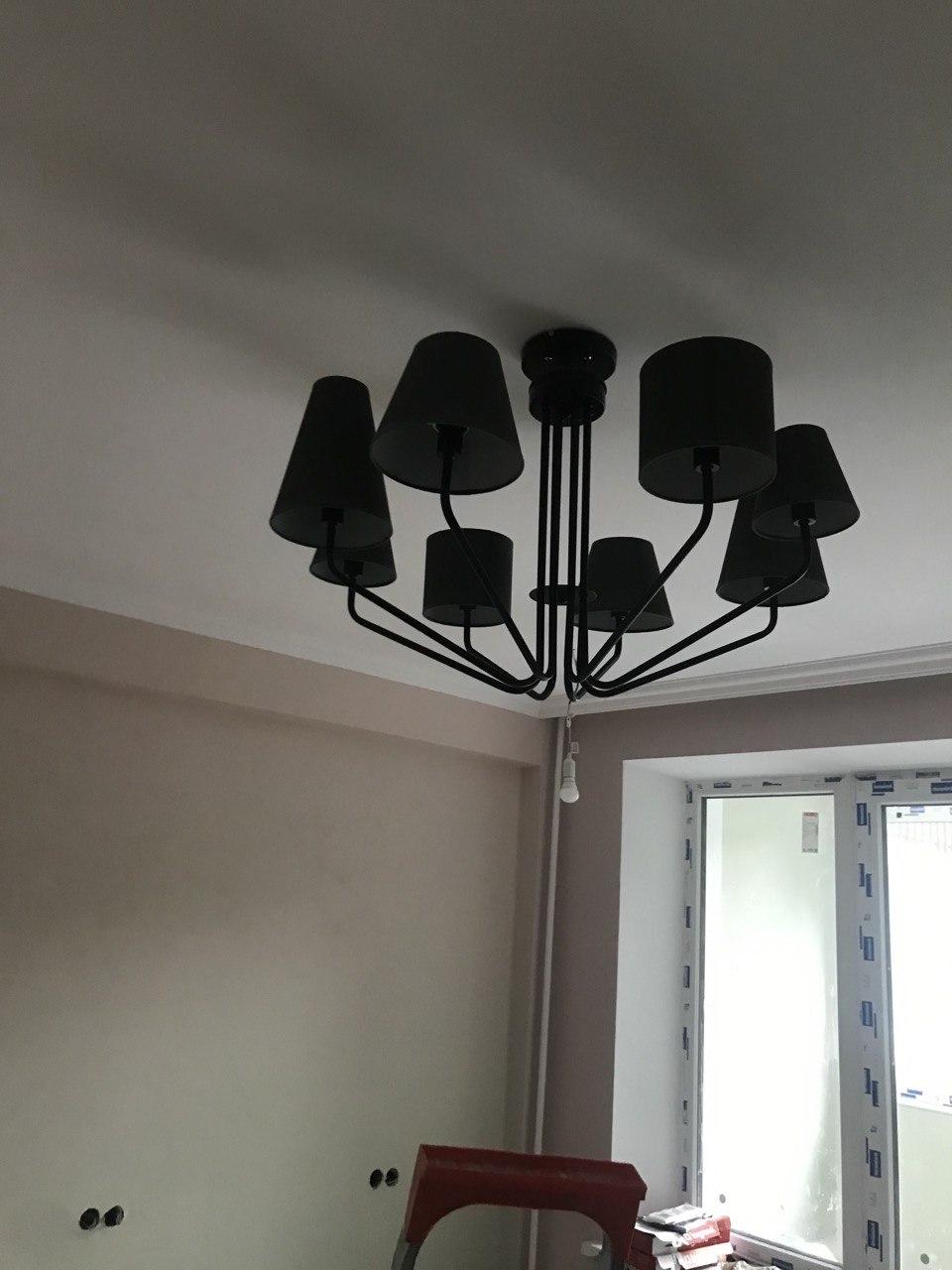 цветовое решение абсолютно не соответсвует фото. плафоны очень темного цвета хаки на потолке при выключенном свете смотрятся черными, основа на фото кажется вохдушной, на деле достаточно объемные черные палочки... на потолке выглядит черным пауком... так как люстру муж собрал и повесил без меня, возврату уже не подлежит((… буду искать мастерскую, по перетягиванию абажуров…