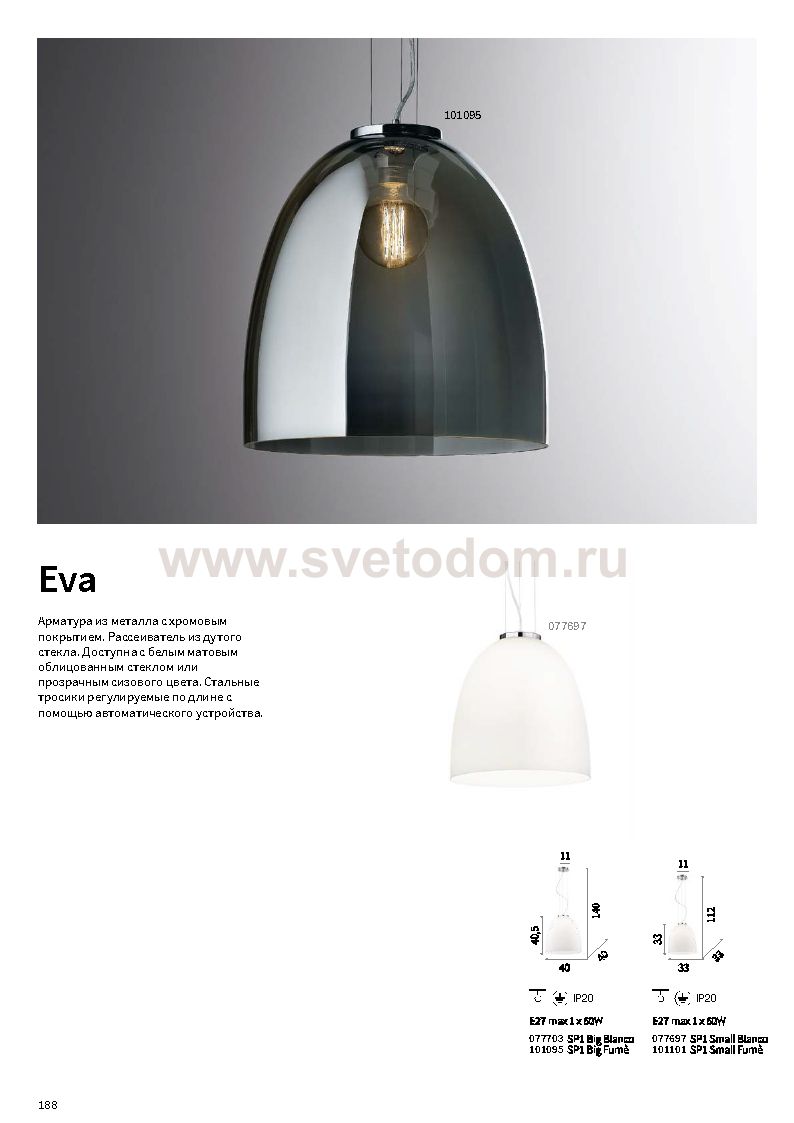 Подвесной светильник – это универсальный вариант, подходящий для любой комнаты. Сегодня производители предлагают огромный выбор таких моделей по самым разным ценам. В каталоге интернет-магазина «Светодом» мы собрали большое количество интересных и оригинальных светильников по выгодной стоимости. Вы можете приобрести их в Москве, Екатеринбурге и любом другом городе России. Подвесной светильник Ideal lux EVA SP1 BIG BIANCO сразу же привлечет внимание Ваших гостей благодаря стильному исполнению. Благородный дизайн позволит использовать эту модель практически в любом интерьере. Она обеспечит достаточно света и при этом легко монтируется. Чтобы купить подвесной светильник Ideal lux EVA SP1 BIG BIANCO, воспользуйтесь формой на нашем сайте или позвоните менеджерам интернет-магазина.