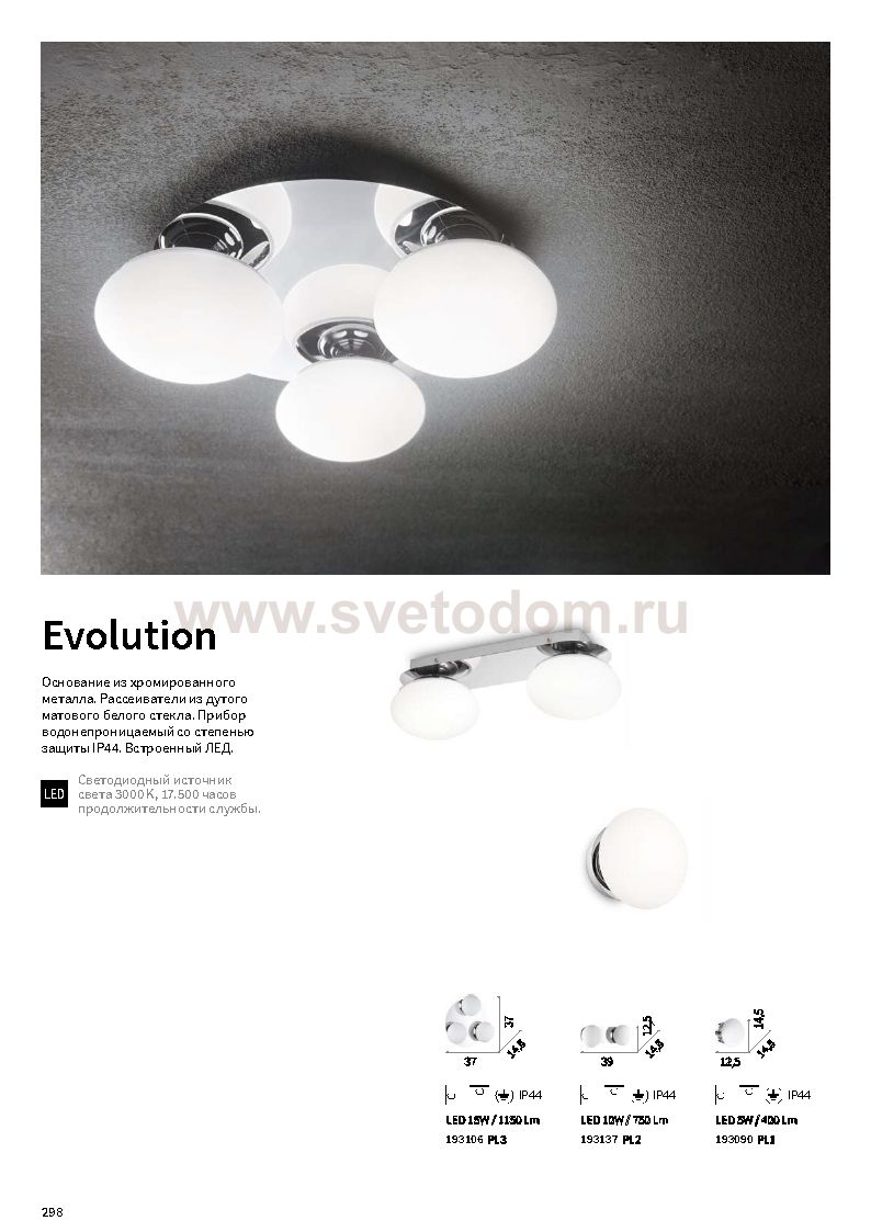 Потолочный светильник от известной итальянской фабрики Ideal lux из каталога Moderno в современном стиле под артикулом EVOLUTION PL3 (193106) серии EVOLUTION имеет ряд отличительных характеристик: Основание из хромированного металла. Рассеиватели из дутого матового белого стекла. Прибор водонепроницаемый со степенью защиты IP44. Встроенный ЛЕД.