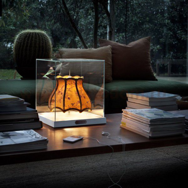 Оригинальный настольный светильник в виде абажура, расшитый золотистой нитью, и помещенный в прозрачный короб.