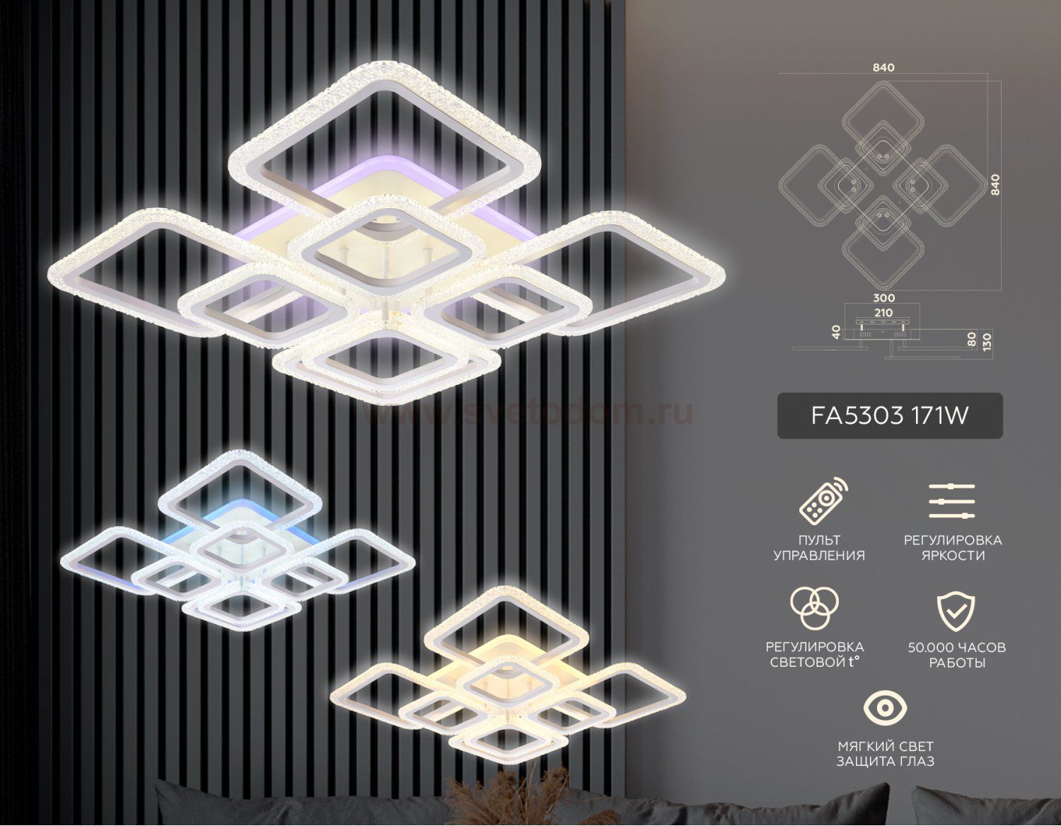 Потолочный светодиодный светильник из серии ACRYLICA, коллекция Original. Непревзойденная модель FA5303 выполнена в современном стиле Хай-тек. Светильник белого цвета, изготовлен из акрила и металлического корпуса. В конструкцию этого светильника уже встроены светодиоды, что исключает поиск или замену дополнительных ламп. С помощью мобильного приложения и радиоуправляемого пульта вы сможете регулировать цветовую температуру, яркость освещения и ночной режим. Эти светильники подходят для натяжных потолков и будут прекрасным дополнением в гостиной, спальне или детской комнате.