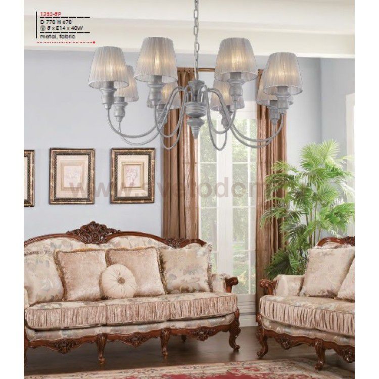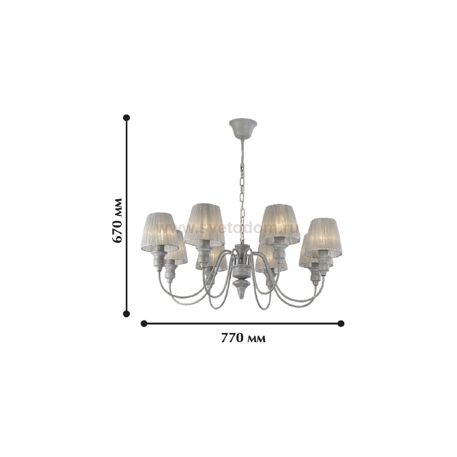 Коллекция Mirage выполнена в редком скандинавском сером цвете с белой патиной. Цвет ткани абажуров подобран в тон каркасу - нежно-серая органза. Материал плафона