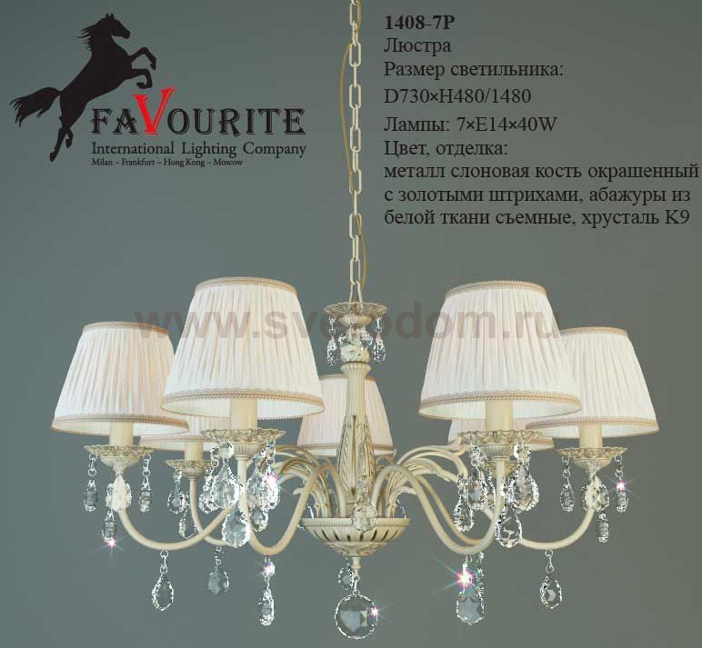 Компания «Светодом» предлагает широкий ассортимент люстр от известных производителей. Представленные в нашем каталоге товары выполнены из современных материалов и обладают отличным качеством. Благодаря широкому ассортименту Вы сможете найти у нас люстру под любой интерьер. Мы предлагаем как классические варианты, так и современные модели, отличающиеся лаконичностью и простотой форм. Стильная люстра Favourite 1408-7P станет украшением любого дома. Эта модель от известного производителя не оставит равнодушным ценителей красивых и оригинальных предметов интерьера. Люстра Favourite 1408-7P обеспечит равномерное распределение света по всей комнате. При выборе обратите внимание на характеристики, позволяющие приобрести наиболее подходящую модель. Купить понравившуюся люстру по доступной цене Вы можете в интернет-магазине «Светодом». |
