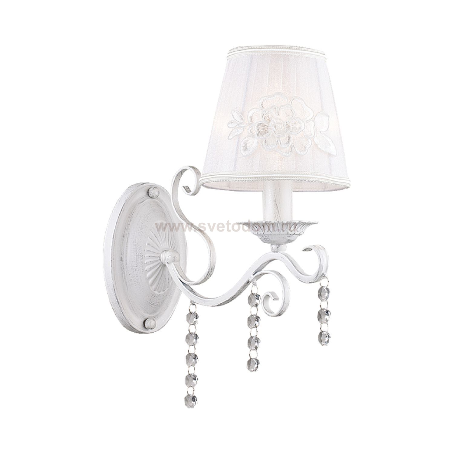 каркас окрашен в белый цвет с серебряной патиной, абажур из белой ткани украшен декоративной аппликацией в виде цветочного кружева, хрустальные подвес Серия