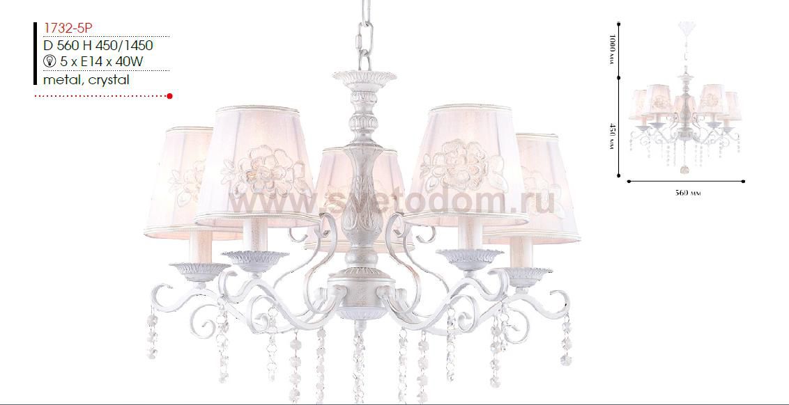 Выбирая модель светильника Favourite 1732-5P, обратите внимание, что каркас окрашен в белый цвет с серебряной патиной, абажур из белой ткани украшен декоративной аппликацией в виде цветочного кружева, хрустальные подвески высшего качества. Дополнительная информация в характеристиках или по телефону. |