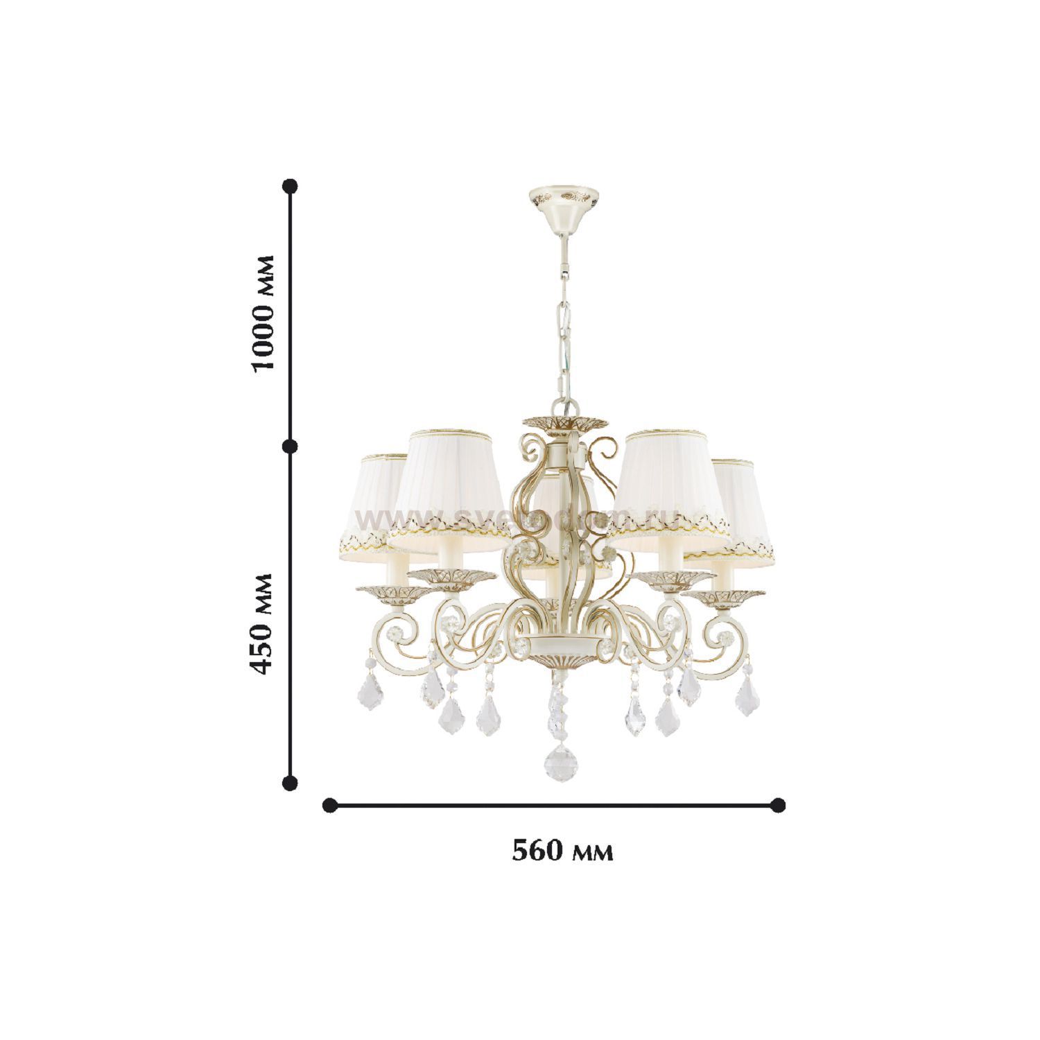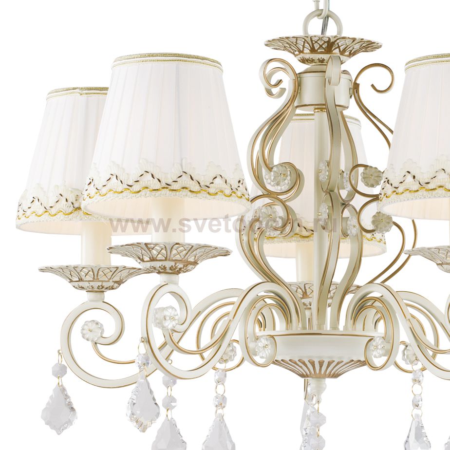 каркас окрашен в цвет слоновой кости с позолотой, абажур из белой ткани украшен тесьмой с золотистым узором, хрустальные подвески высшего качества Материал плафона