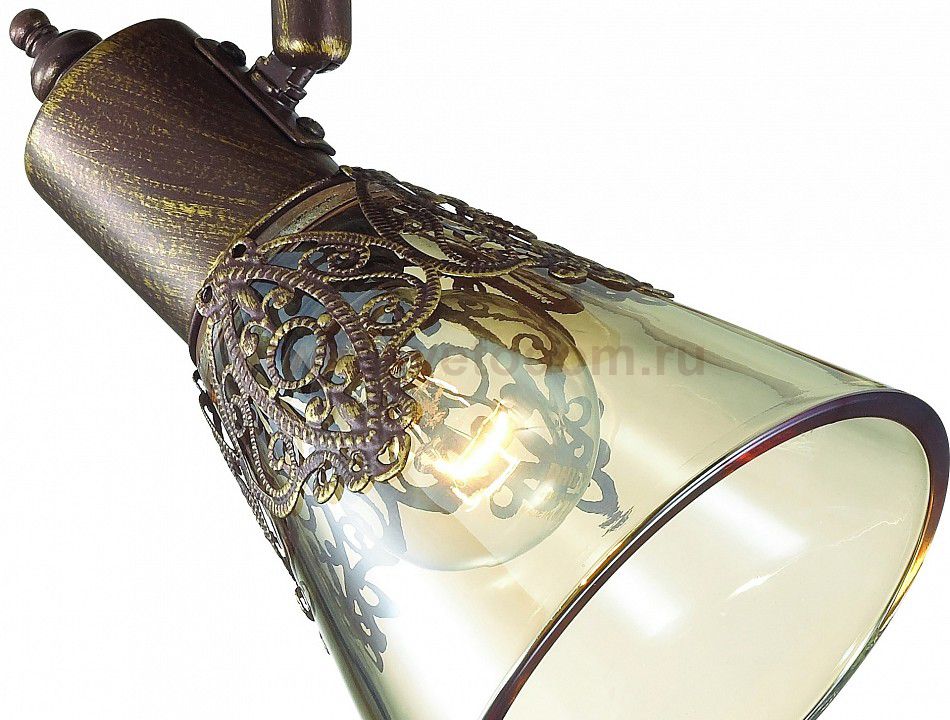 каркас коричневого цвета с золотой патиной, декоративный узор из металла на плафоне, плафон из прозрачного стекла коньячного оттенка Штрих-код