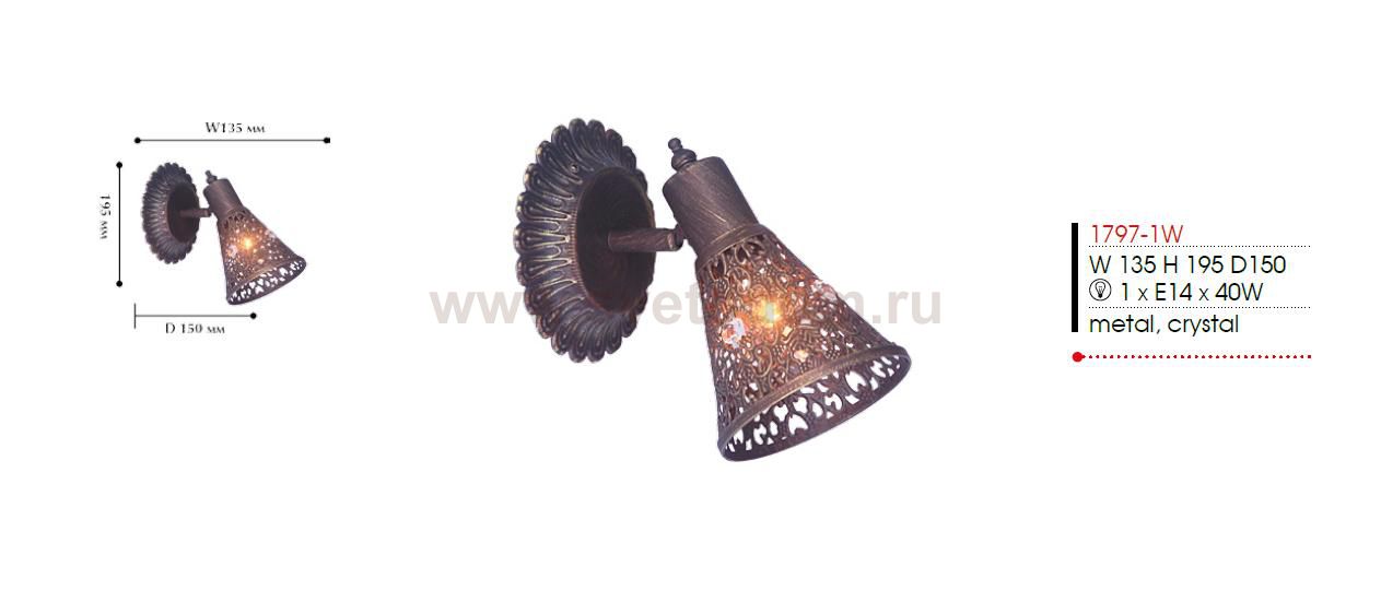 Выбирая модель светильника Favourite 1797-1W, обратите внимание, что каркас коричневого цвета с золотой патиной, плафон из металла с отделкой хрусталем. Дополнительная информация в характеристиках или по телефону. |
