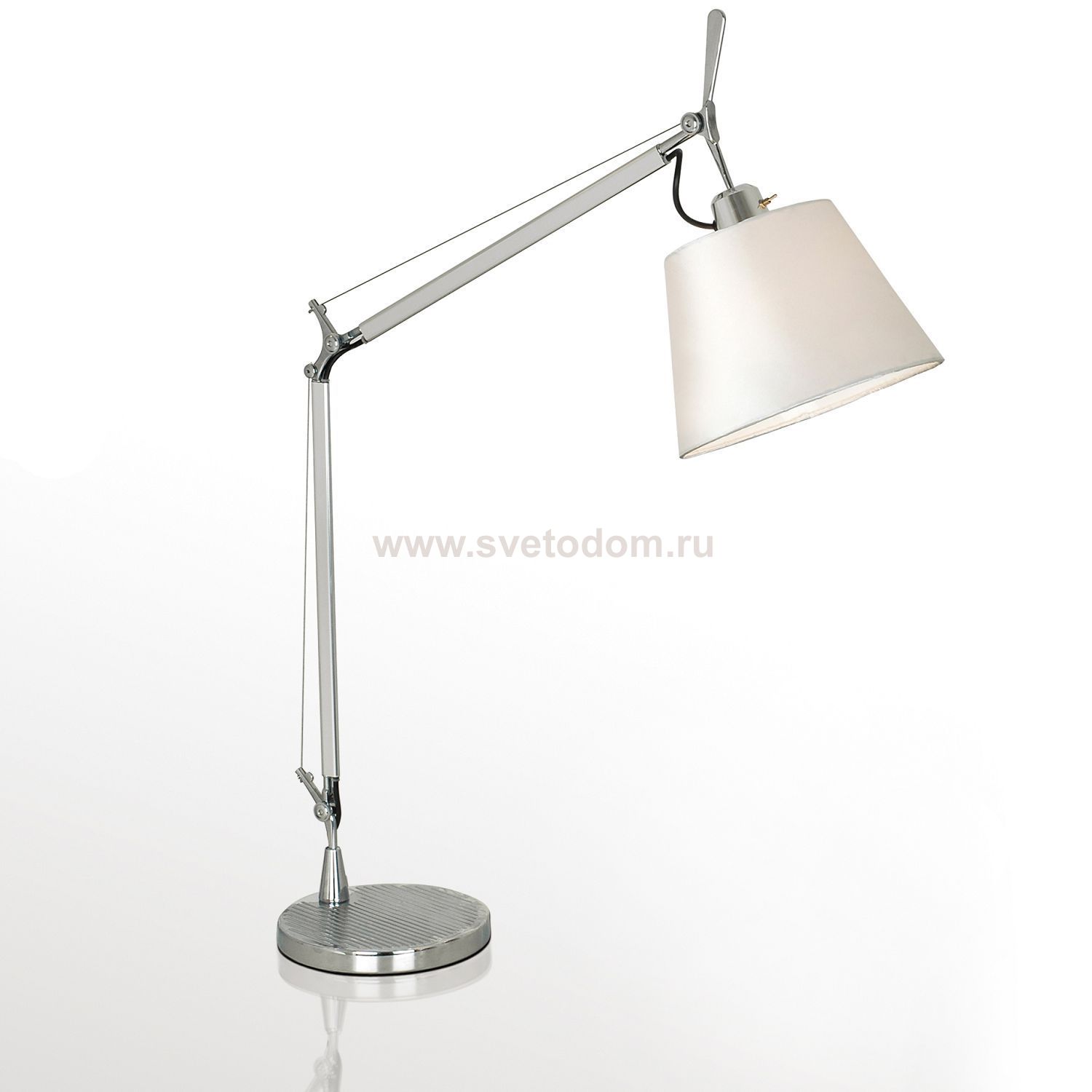 металл окрашен в серебряный цвет, абажур из белой ткани, двухступенчатая система сгибания основания Материал плафона