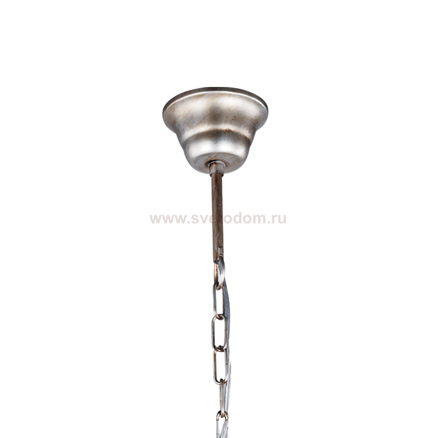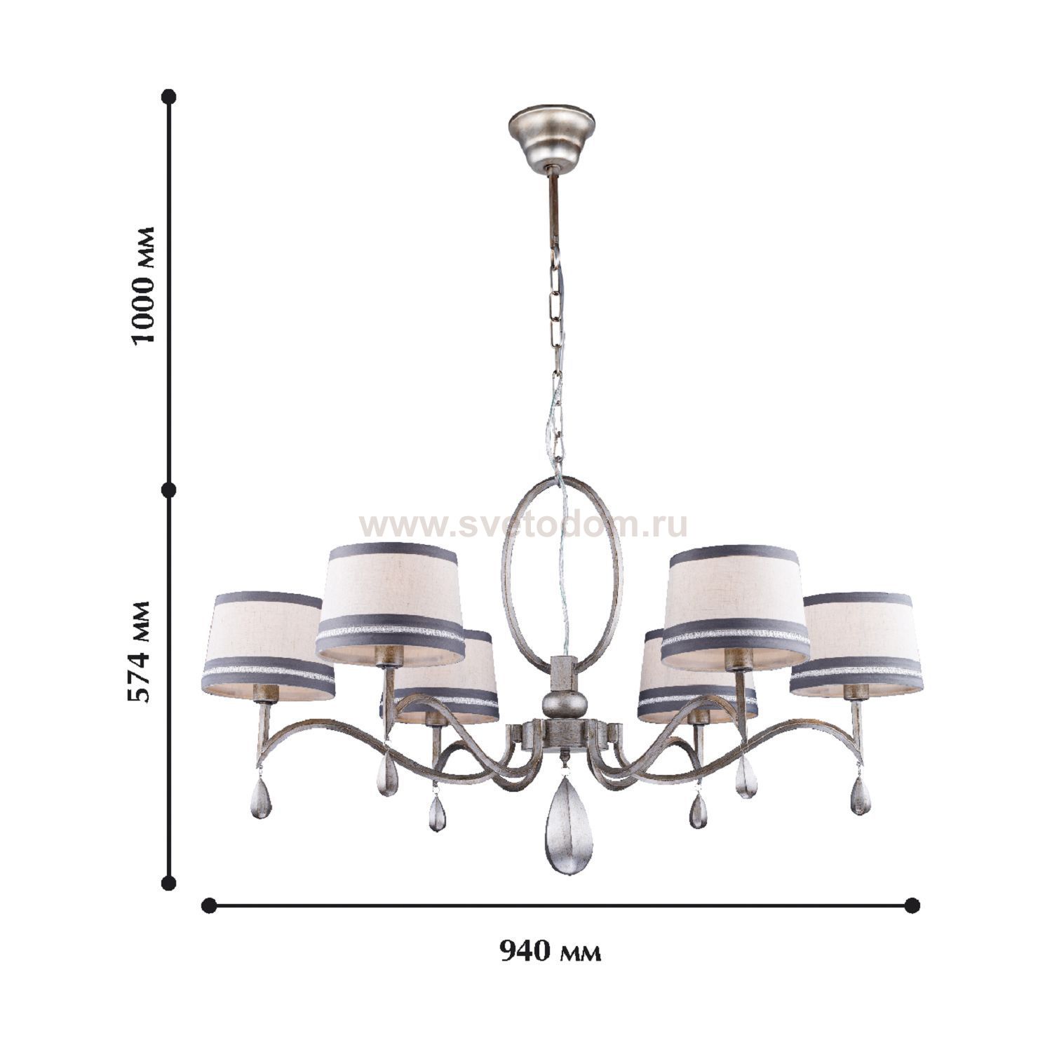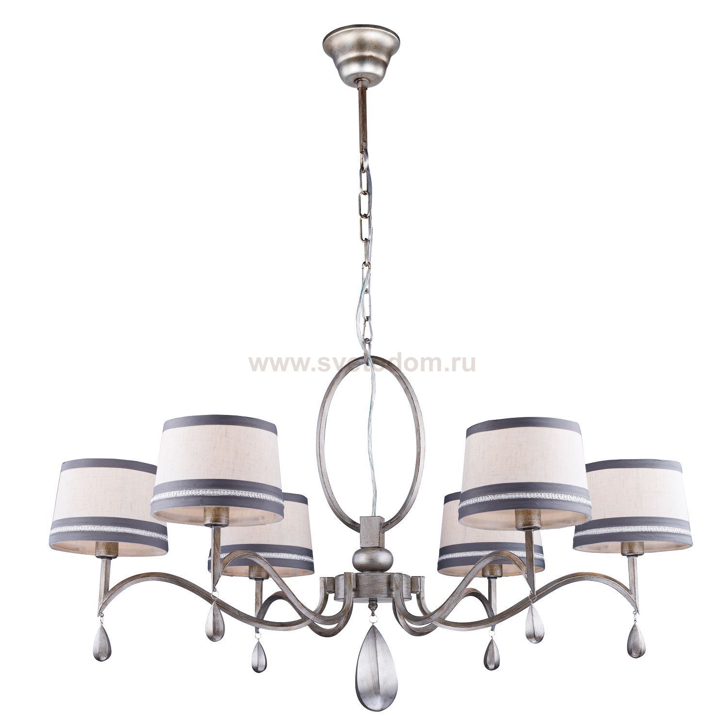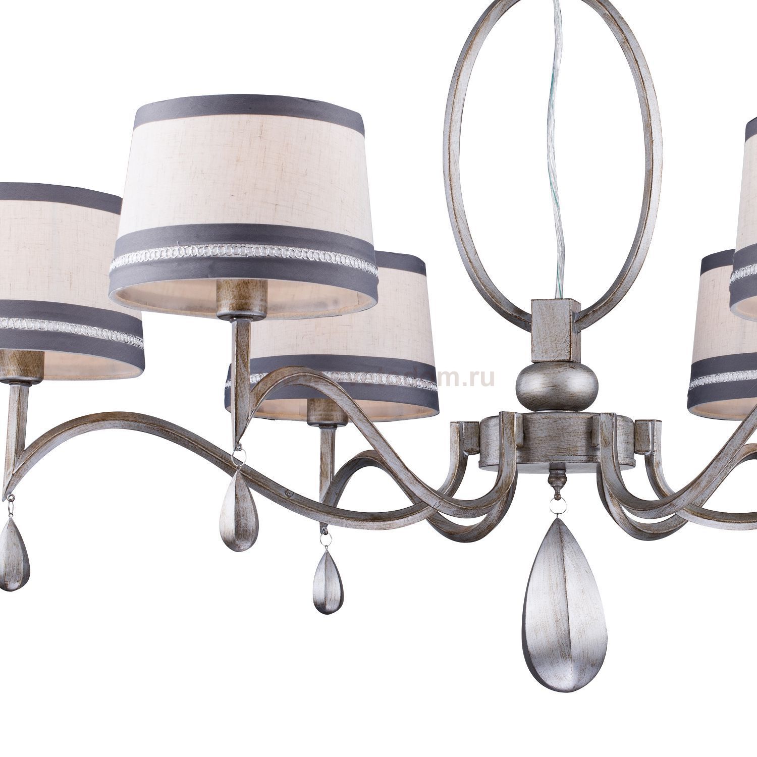 арматура окрашена в цвет античного серебра (патинированное серебро), абажуры из белой ткани декорированы узорной тесьмой, светильники украшены подвесками из гипса в цвет арматуры Материал плафона