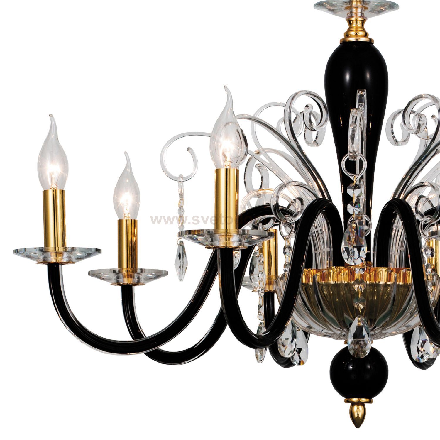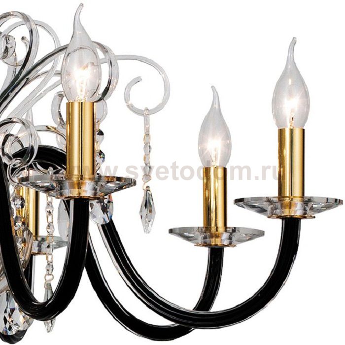 металл золотого цвета, стеклянные выдувные рожки черного цвета и декоративные элементы прозрачного цвета Материал плафона