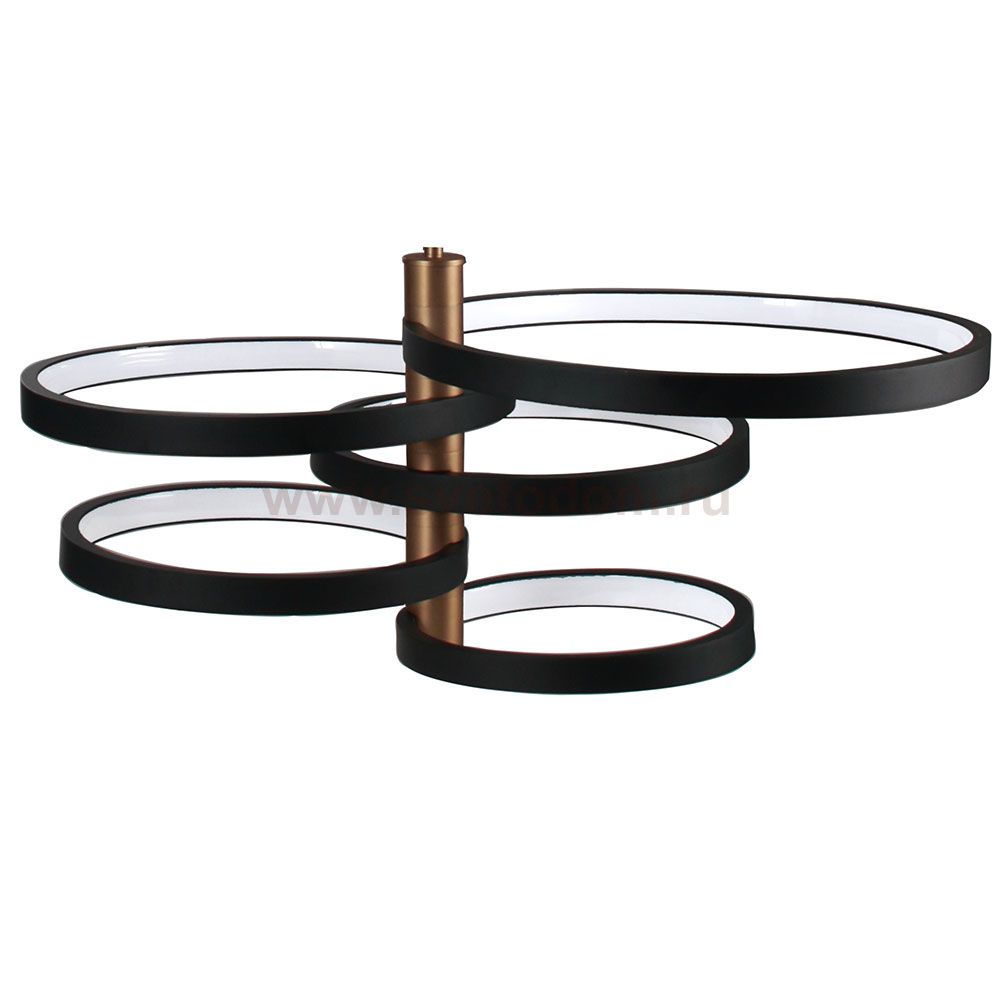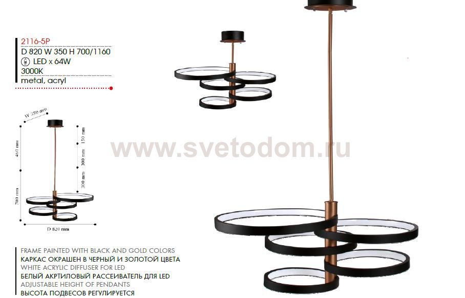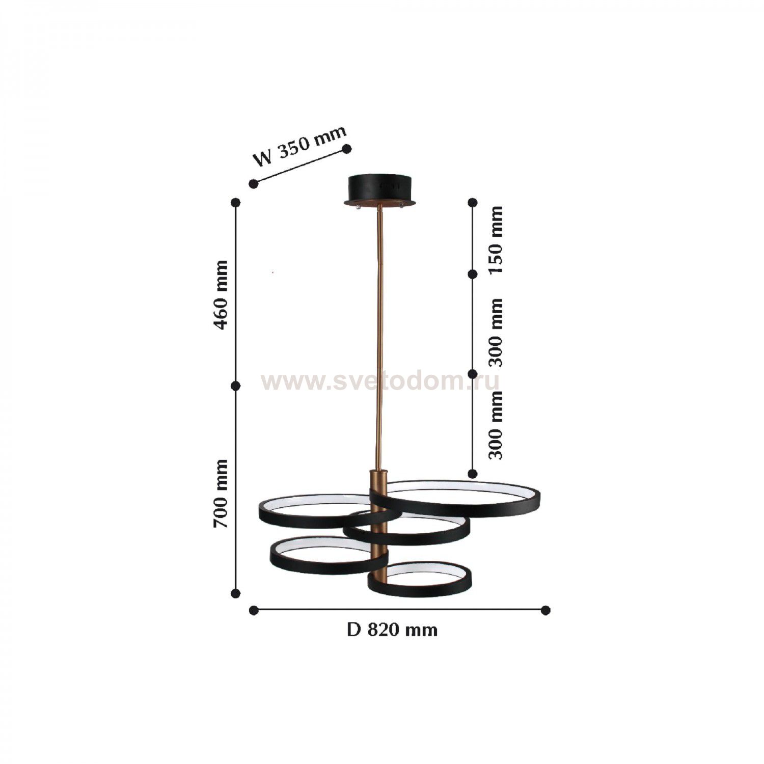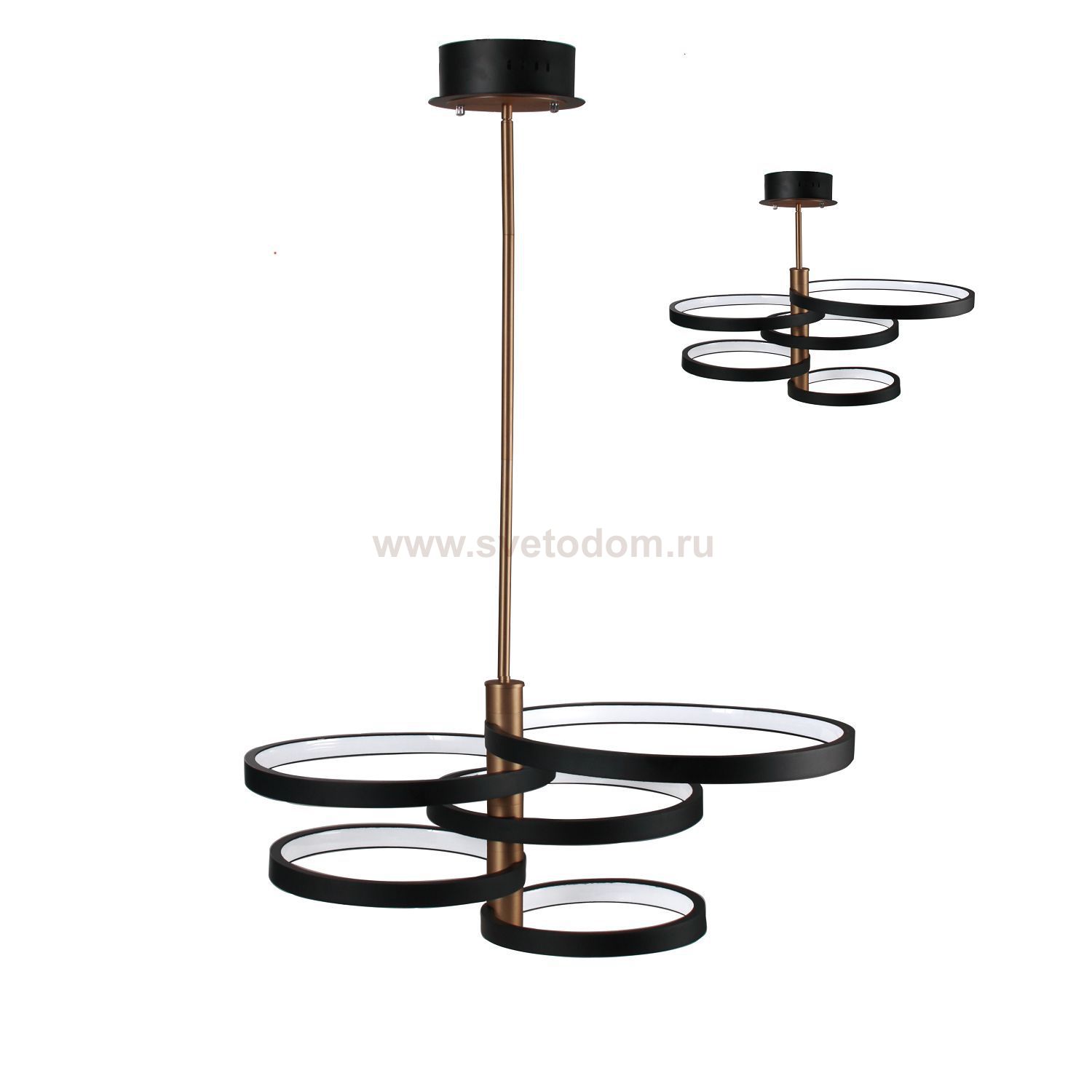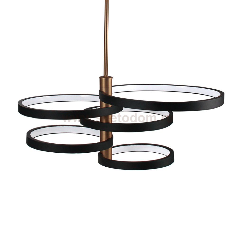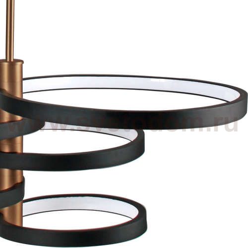 каркас окрашен в черный цвет в сочетании с золотым, белый акриловый рассеиватель LED, кольца могут вращаться вокруг центральной оси, регулируемая высота за счет составной из нескольких частей центральной трубки Материал плафона