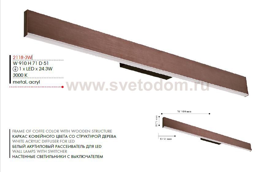 каркас кофейного цвета со структурой дерева, белый акриловый рессеиватель LED, выключатель Комментарий
