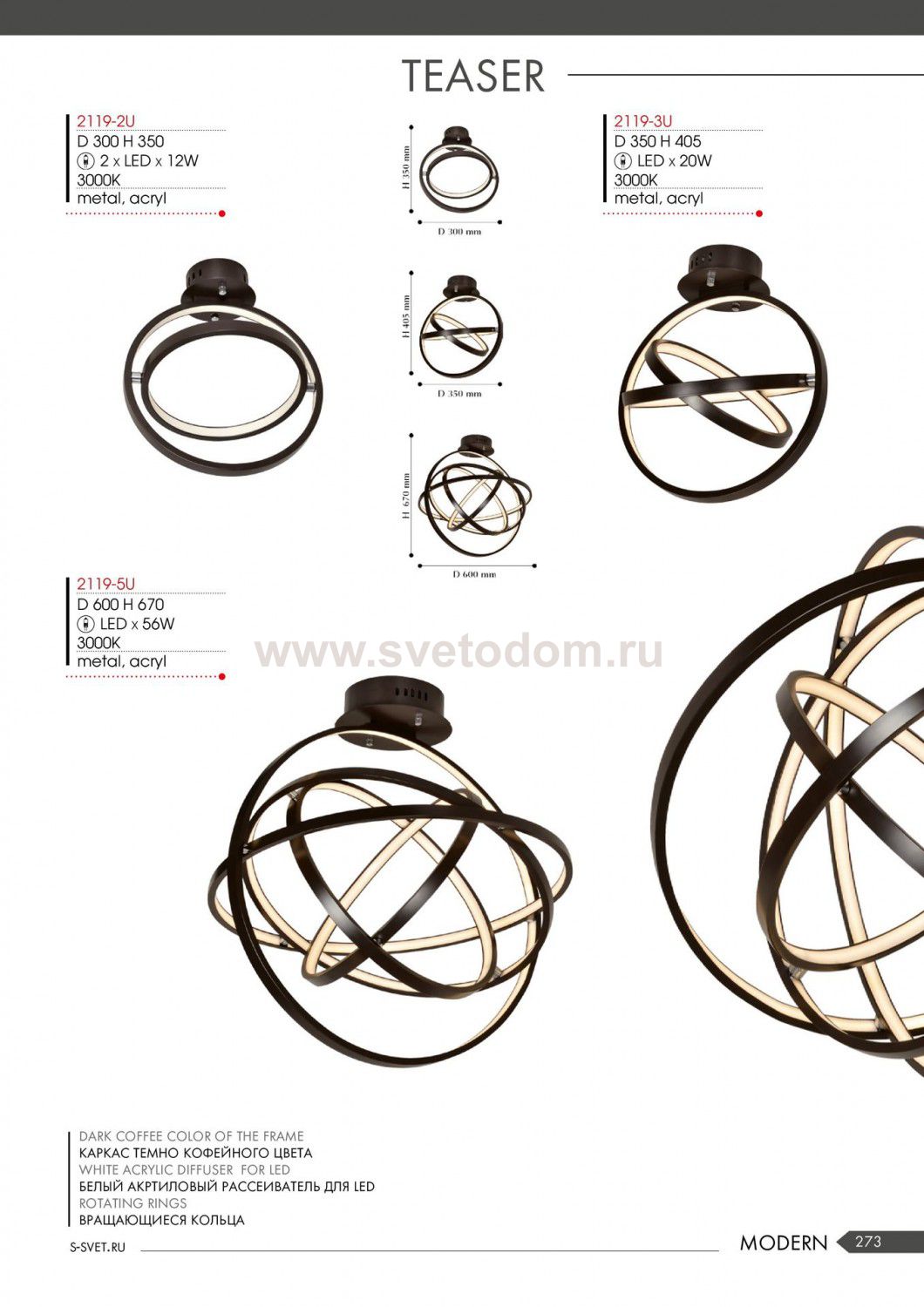 каркас темно-кофейного цвета, белый акриловый рассеиватель LED, вращающиеся кольца Комментарий
