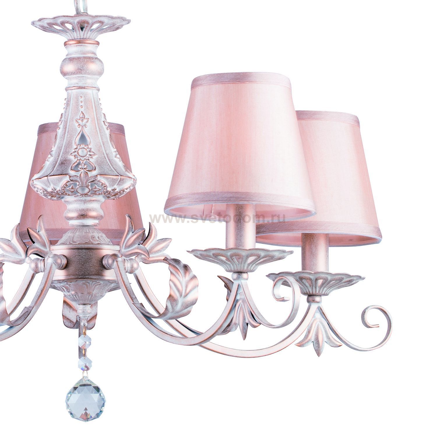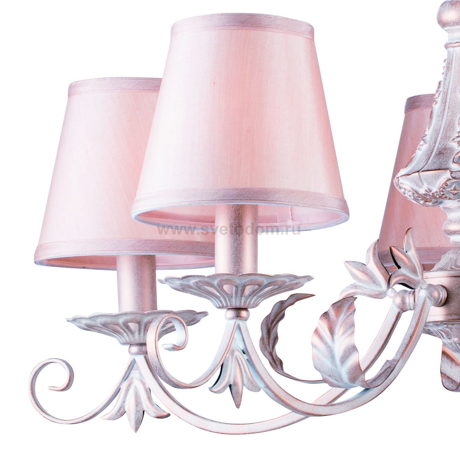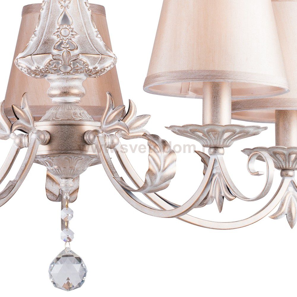 Металл окрашен в белый цвет с густой жемчужно-золотистой патиной. Атласные абажуры кремового оттенка прекрасно дополняют общий облик светильников. Материал плафона