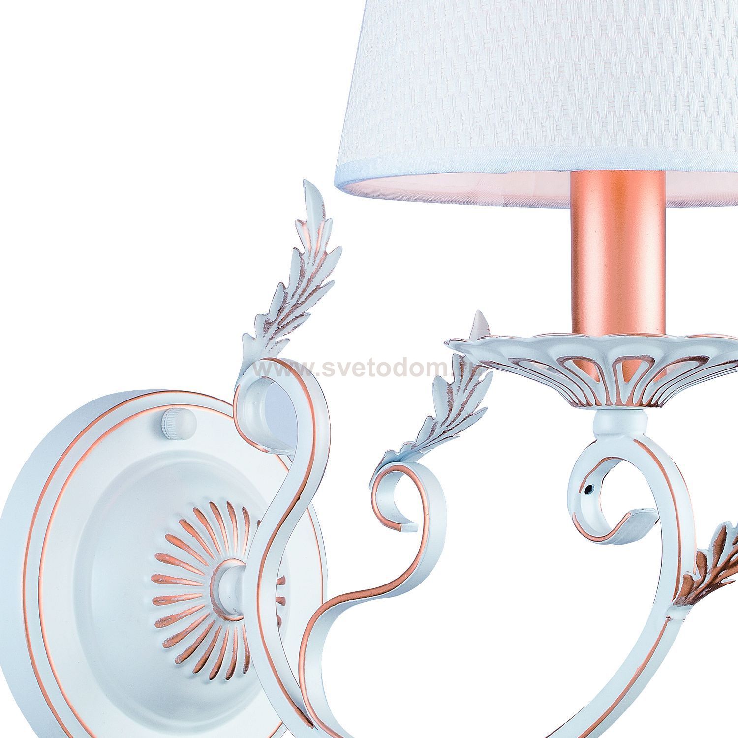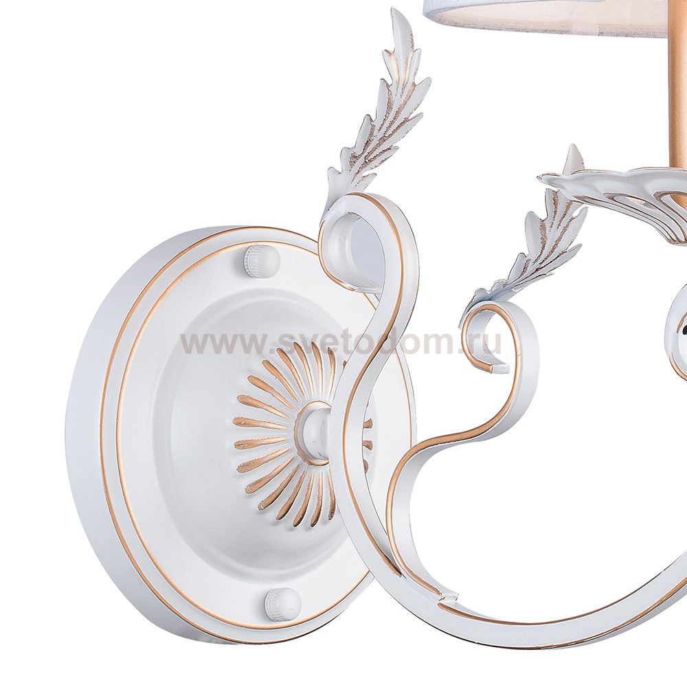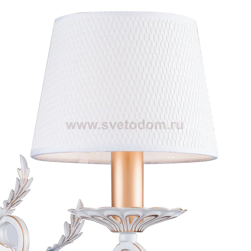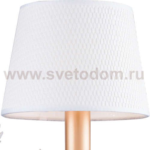 Каркас белого цвета с золотой патиной с акцентом на золоченых стаканах цоколей. Абажуры слегка увеличенной формы и белой хлопковой ткани с крупной ажурной фактурой. Материал плафона