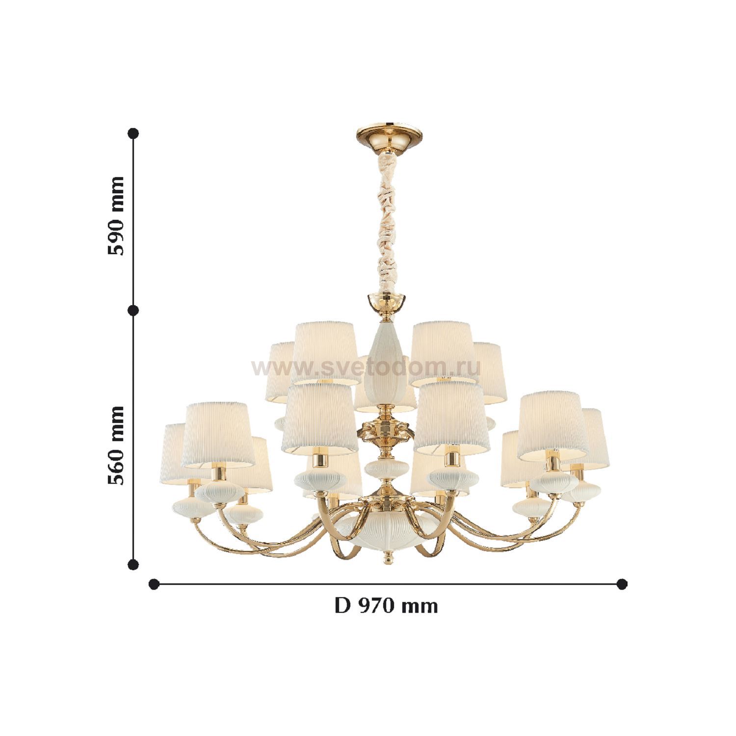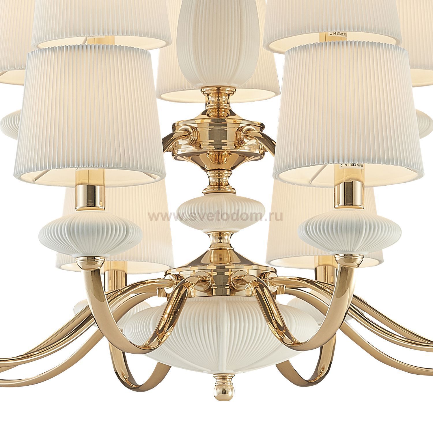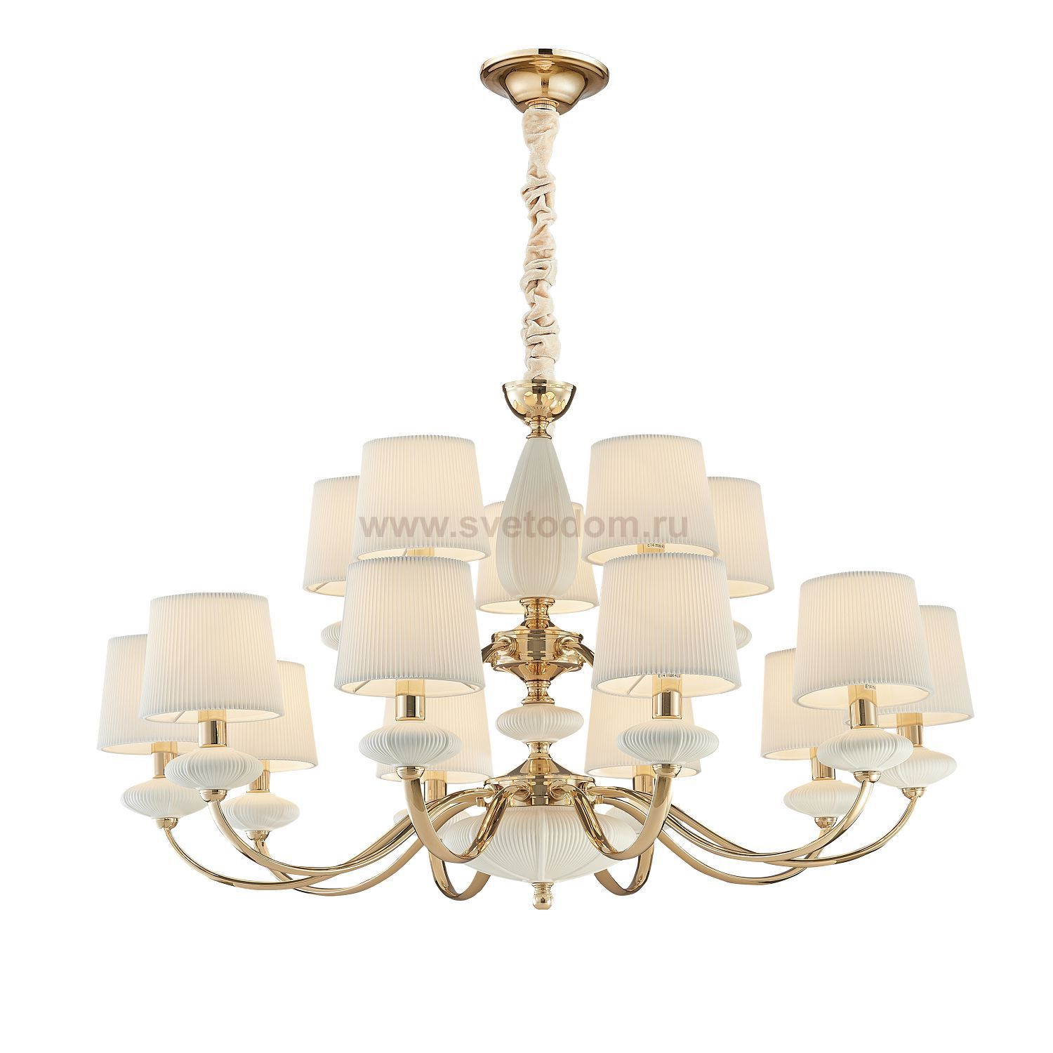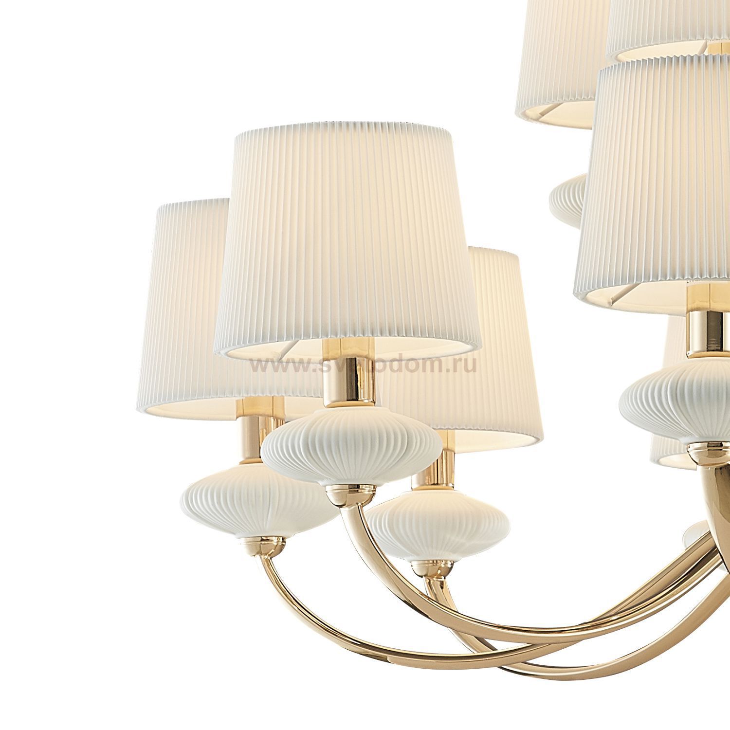 каркас цвета золотой гальваники, декоративные элементы из белой керамики, абажуры из белой гофрированной ткани Комментарий