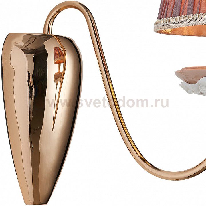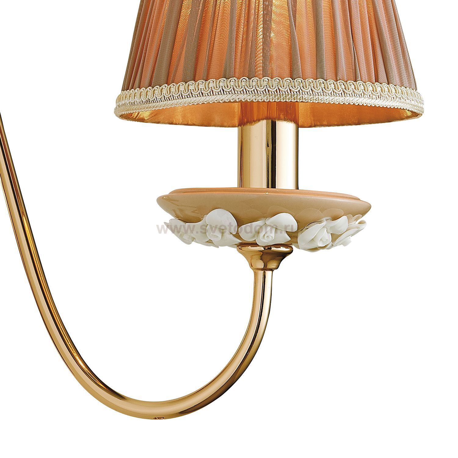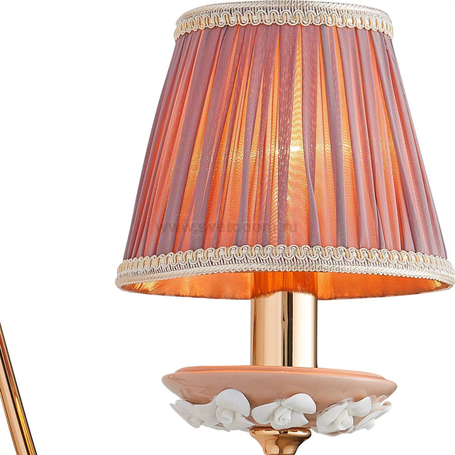 каркас цвета золотой гальваники, декоративные элементы из керамики бежевого цвета с белыми керамическими цветами и подвесками, абажуры из пыльно-розовой ткани Комментарий
