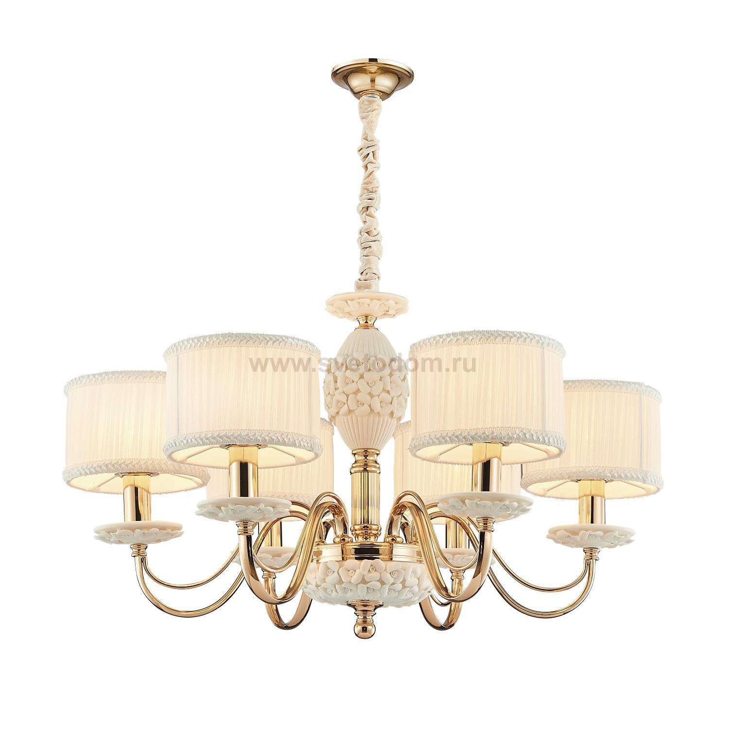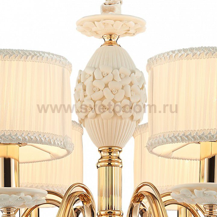 каркас покрыт гальваникой золотого цвета, декоративные элементы из керамики белого цвета, абажуры из белой органзы с узорной лентой Материал плафона