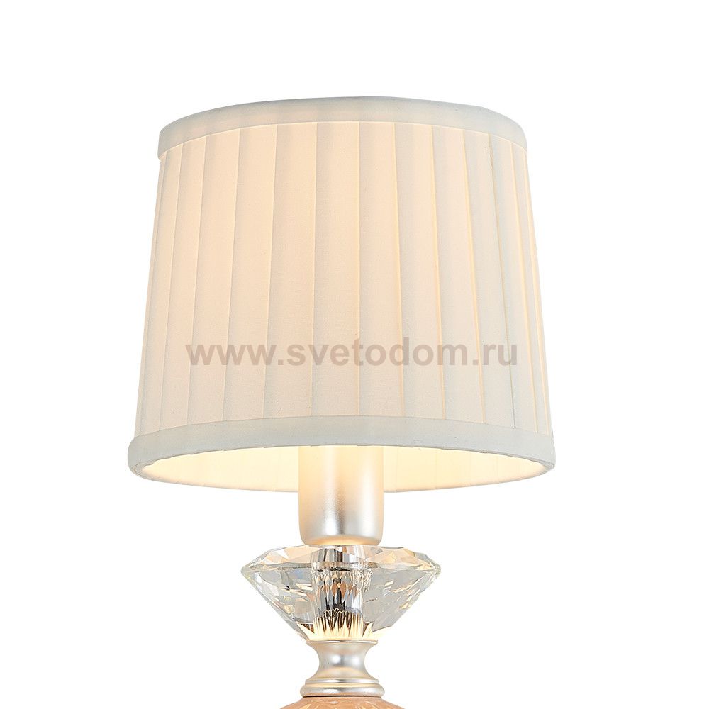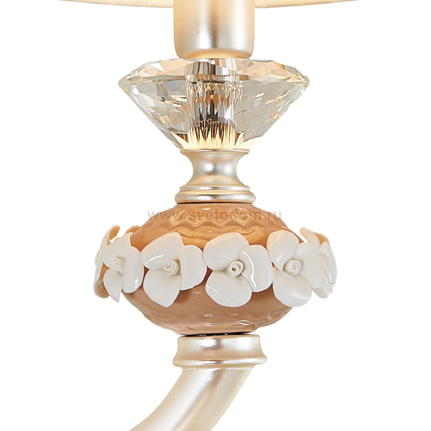 каркас серебряного цвета, декоративные элементы из керамики бежевого цвета с белыми керамическими цветами, абажуры из белой хлопковой ткани Материал плафона