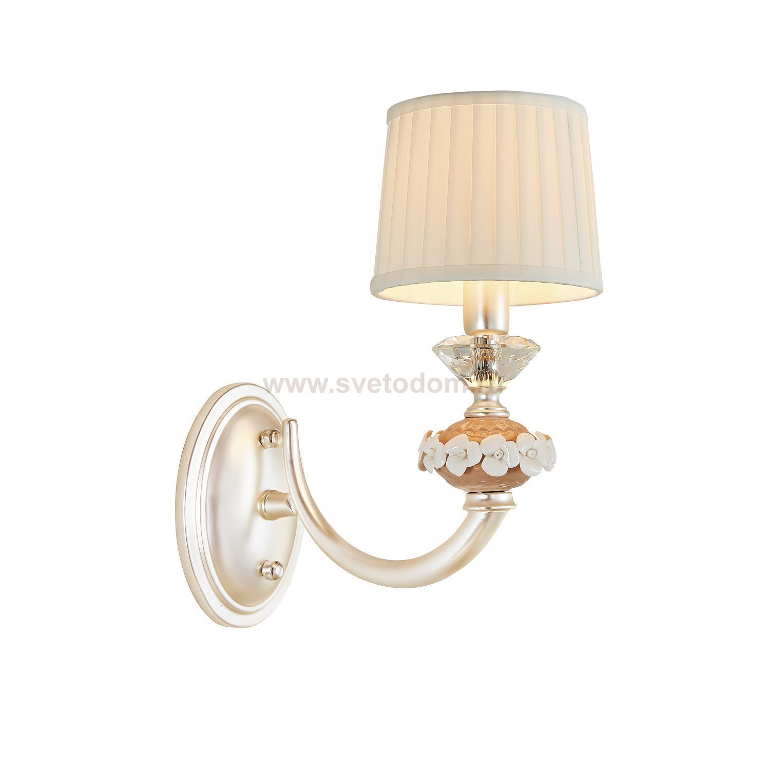 каркас серебряного цвета, декоративные элементы из керамики бежевого цвета с белыми керамическими цветами, абажуры из белой хлопковой ткани Комментарий