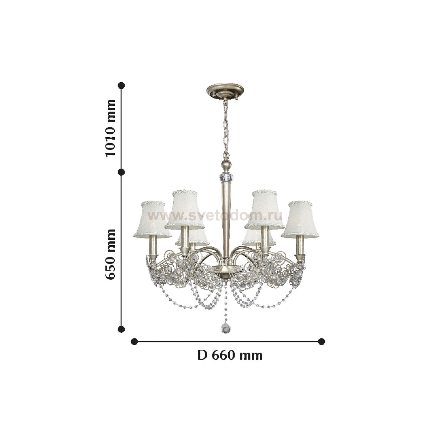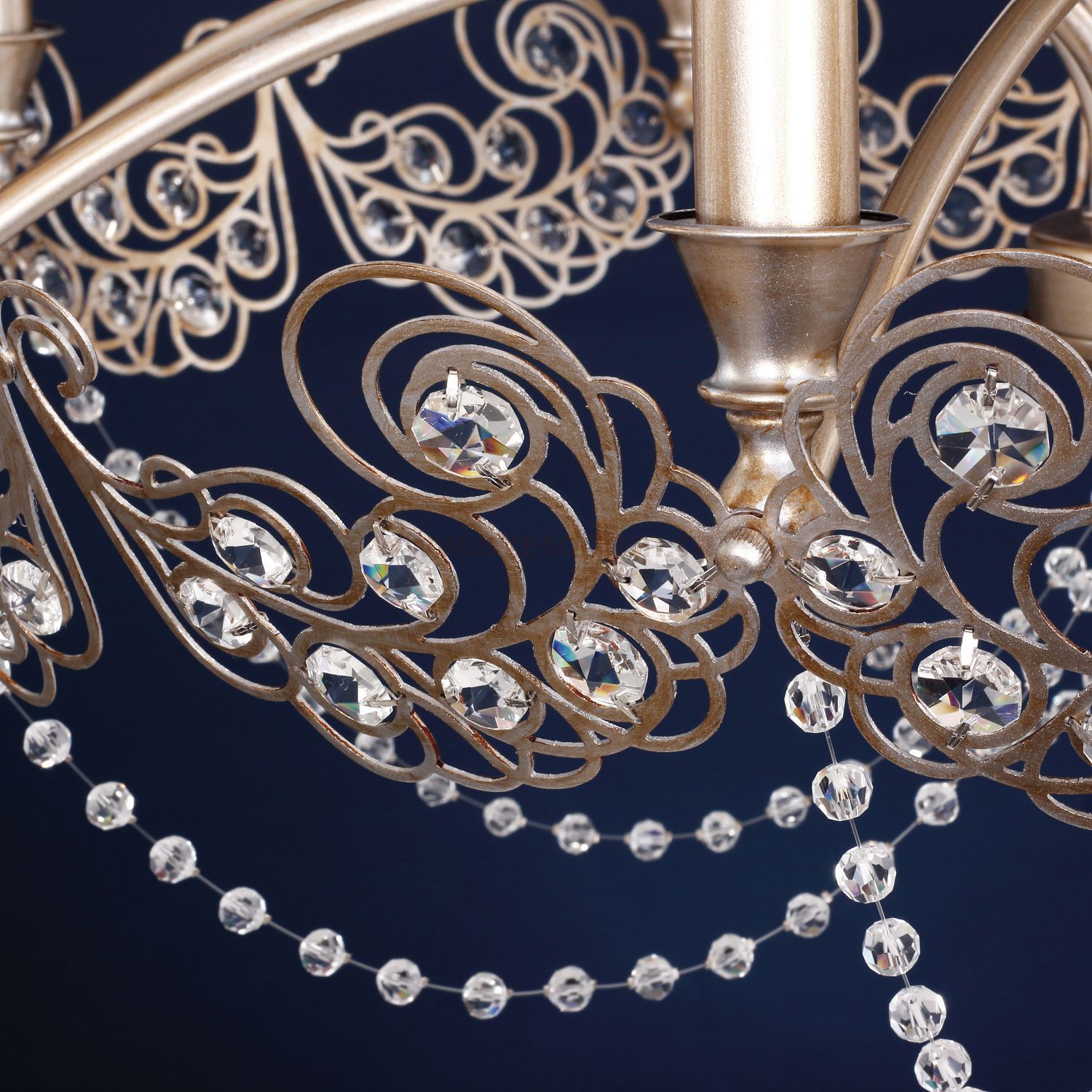 каркас окрашен в цвет античное серебро, абажуры из белой ткани, хрусталь высшего качества Комментарий