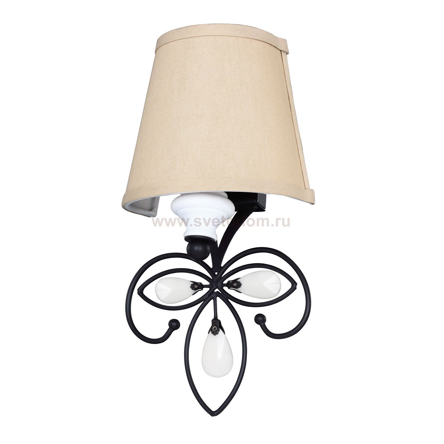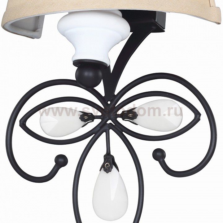 каркас окрашен в черный цвет с декоративными элементами белого цвета, тканевые абажуры из бежевого хлопка с фактурой рогожки, белый хрусталь Комментарий