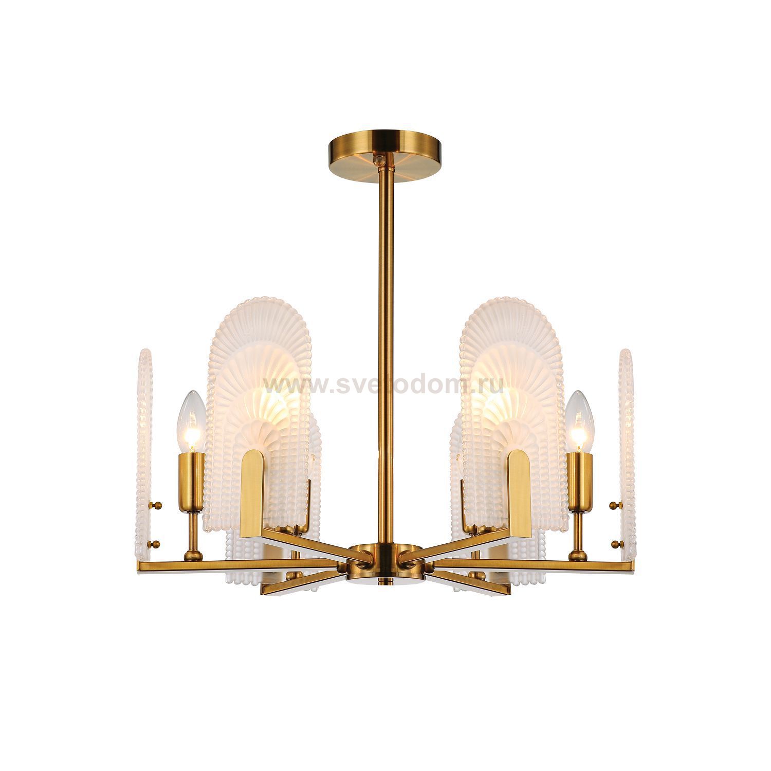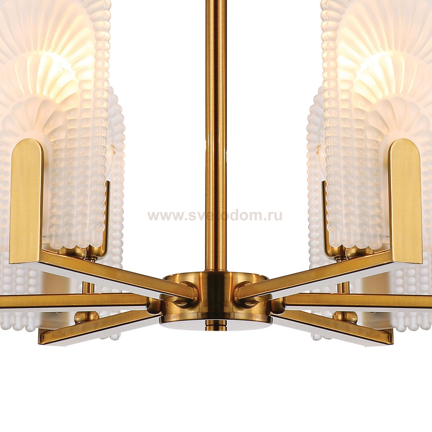 каркас светильника покрыт гальваникой цвета латуни, стеклянные плафоны выполнены из узорного стекла, напоминающего многоярусные арки, матового цвета Штрих-код